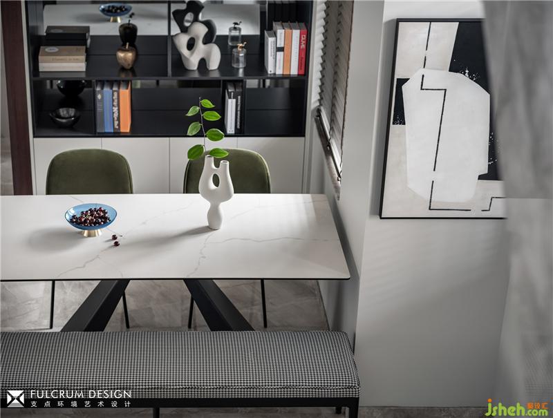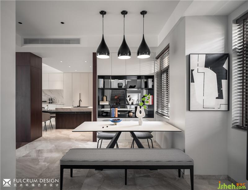 在距離廚房更近的地方,設(shè)置供業(yè)主一家三口平常吃飯的餐桌,設(shè)計(jì)師在置物架背板用鏡面材質(zhì),擴(kuò)張空間視覺感。