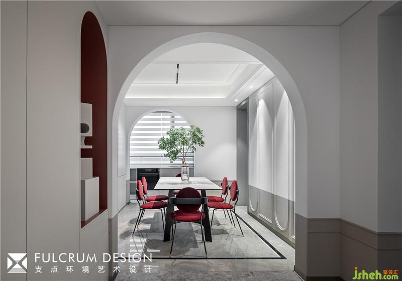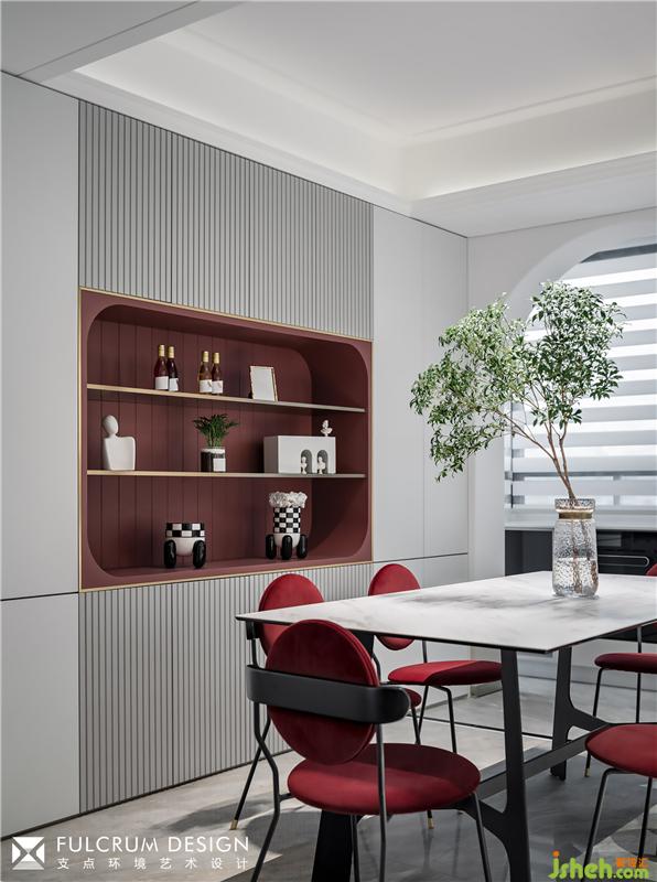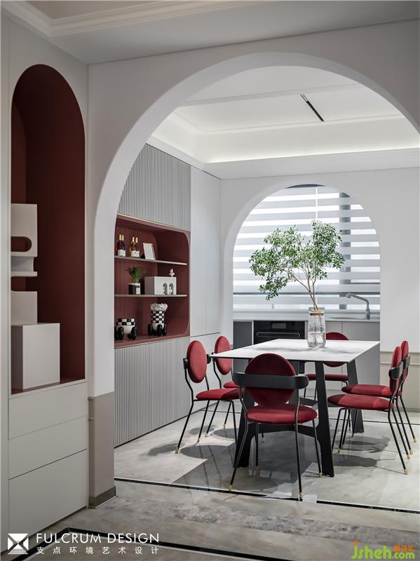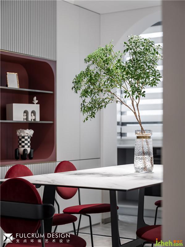 框架感餐桌椅緩解餐廳面積緊張,增強(qiáng)空間視覺(jué)通透感。一年四季、三代五人,食自己所愛(ài),觀生命至親。不同質(zhì)感的紅色渲染煙火氣,使其愈發(fā)濃烈。