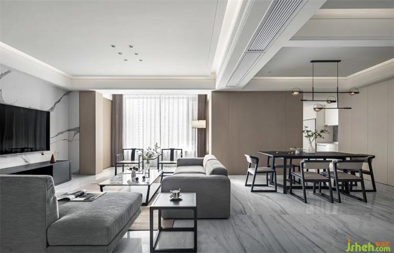 客廳與餐廳的聯(lián)動(dòng),家居設(shè)計(jì)以沙發(fā)為客餐廳的中心,一家四口歡聚于此。