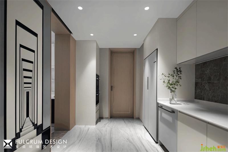 從空間特性和視覺(jué)感受上考慮,選用天軌移門(mén),設(shè)計(jì)師特地請(qǐng)插畫(huà)師,現(xiàn)場(chǎng)設(shè)計(jì)并繪制空間感極強(qiáng)的裝飾畫(huà)飾面,使廚房使用起來(lái)更便利。