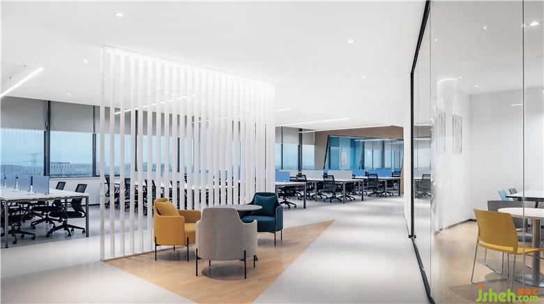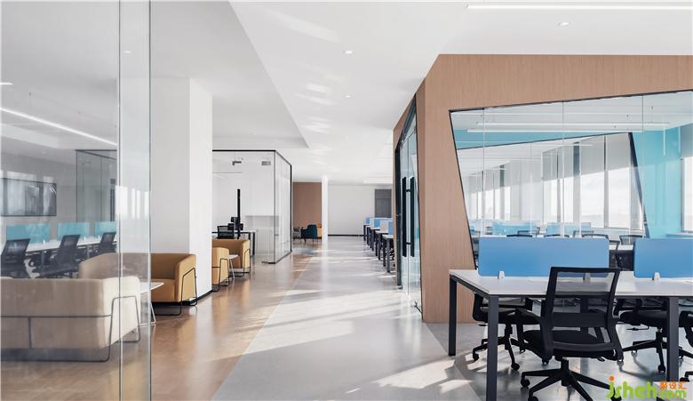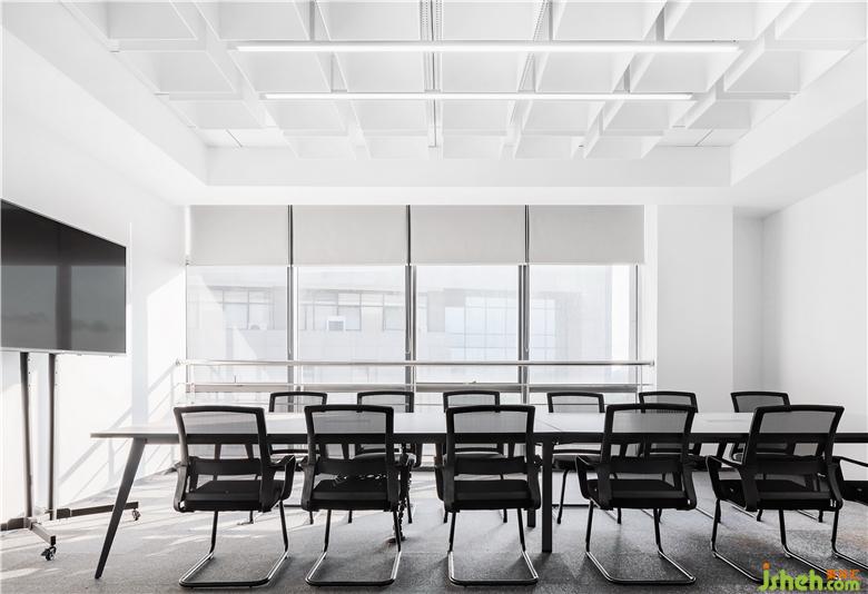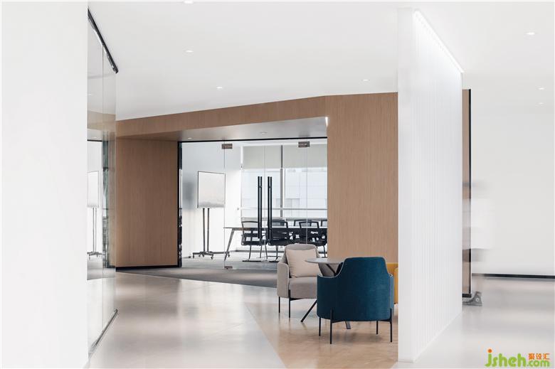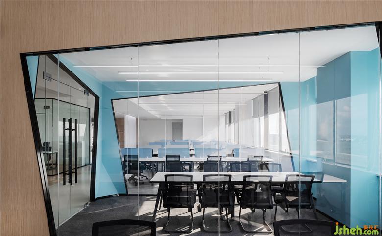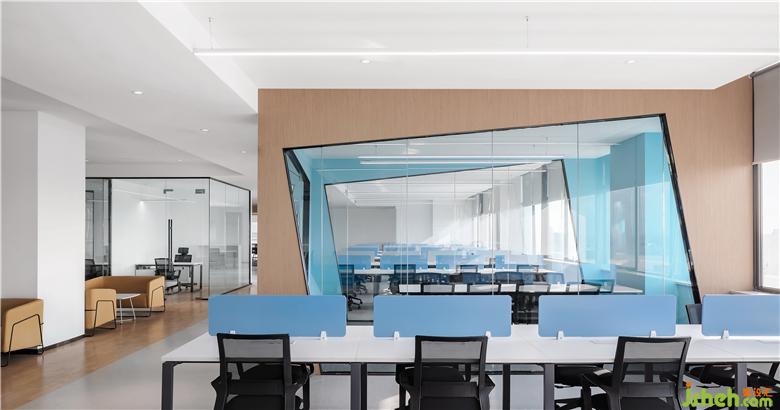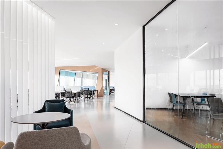 大面積玻璃代替厚重墻體,輕薄的線條邊框隱匿其中,會(huì)議室的物理分區(qū)體量被減至最小?!巴该骱凶印钡慕Y(jié)構(gòu)被光線打通,一個(gè)高端質(zhì)感迭代空間內(nèi),空間與工作發(fā)生緊密而富有無盡創(chuàng)造力的未來。開放式的辦公空間讓傳統(tǒng)的工作日常變了模樣:開闊區(qū)域進(jìn)行集中討論,圍合的空間創(chuàng)造偶遇與快速協(xié)作,格子空間以便集中精力、促發(fā)深度思考,更精準(zhǔn)地把握高效辦公的剛需與日常心理感官的平衡。