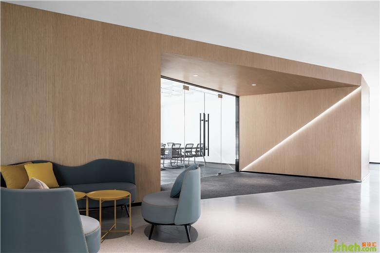 白色烤漆玻璃給予前臺(tái)后方半遮擋效果,摒棄一切繁瑣的浮華,用純粹的材質(zhì)融入日常的舒適感。側(cè)方爭(zhēng)取自然光最大限度的滲透量,以開放、冷靜而煥發(fā)靈感的形象示人。木飾面承載著豐富而厚重的紋理,利落的線條充盈視覺,兩平見方,營造的質(zhì)感大氣優(yōu)雅。辦公室設(shè)計(jì)