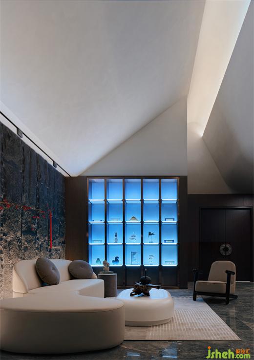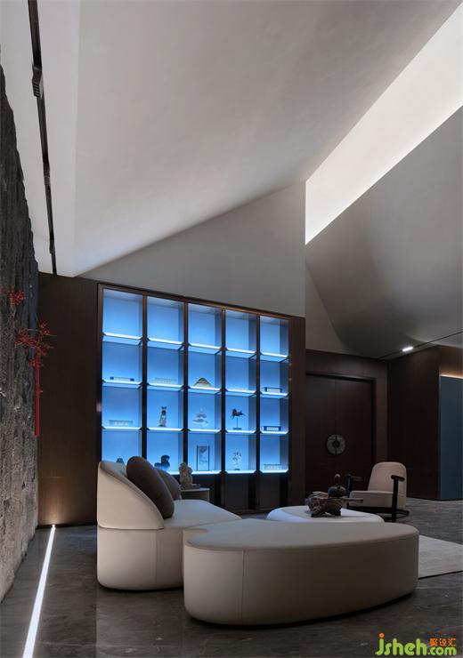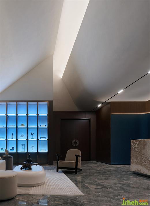 酒店設(shè)計(jì)空間里用解構(gòu)思維來(lái)表達(dá)舒張,將曲線和塊面凸出或交織,通過(guò)色彩和燈光關(guān)系的引導(dǎo),使得空間與材質(zhì)的過(guò)渡變得有序且自然。平入仄出的隱喻細(xì)節(jié),柔化了空間的界限,點(diǎn)線面結(jié)合燈光的組成構(gòu)建,打造視覺(jué)亮點(diǎn)又兼顧整體畫(huà)面。