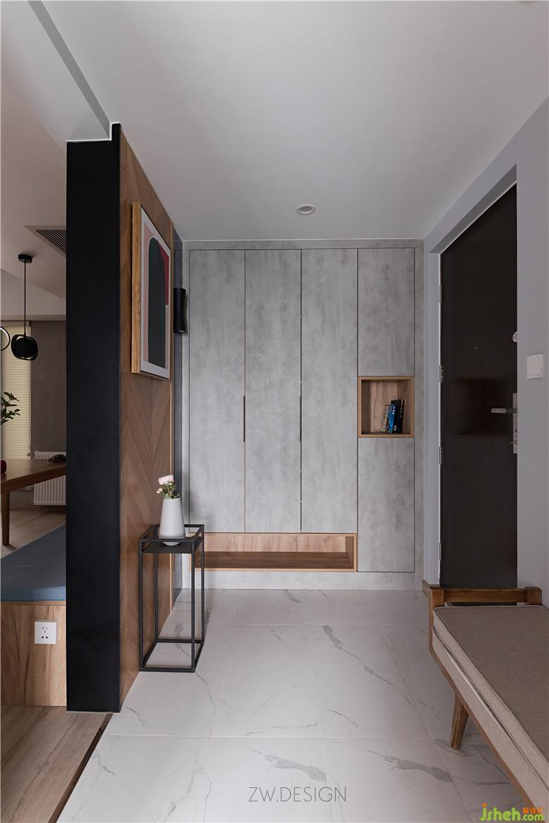 白色大理石地面+水泥灰質(zhì)感的玄關(guān)收納柜+木作的搭配,高級干凈簡單又不失溫暖。條凳的存在,填補了玄關(guān)的單調(diào),舒適的軟墊讓脫換鞋也變成了一種享受。