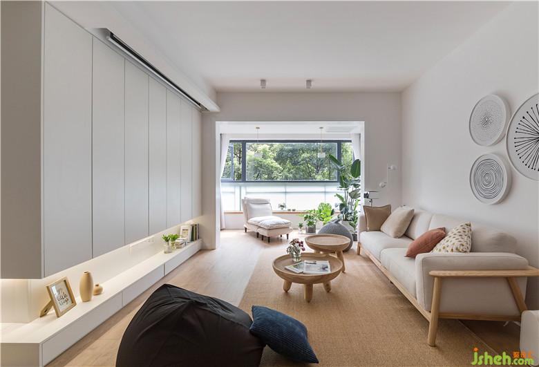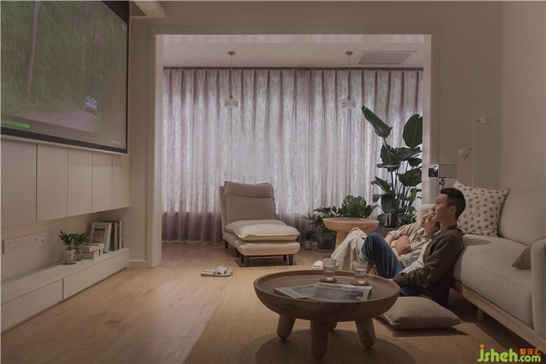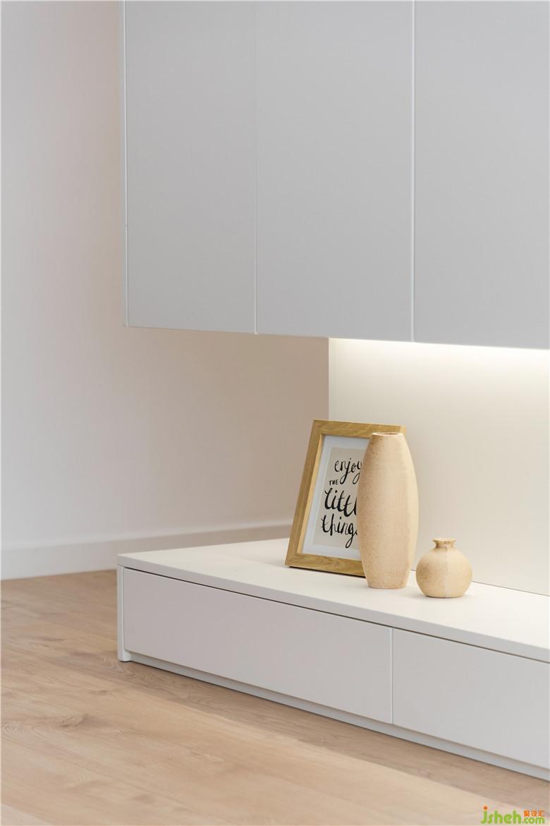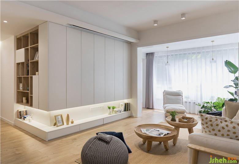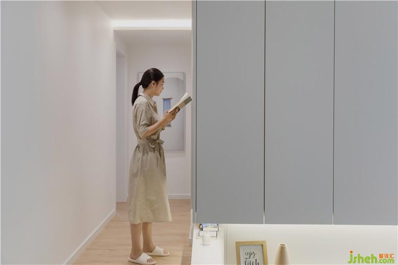 客廳幕布背景墻集收納與裝飾為一體,使原本狹窄的過道在視覺和使用上都顯得更寬敞