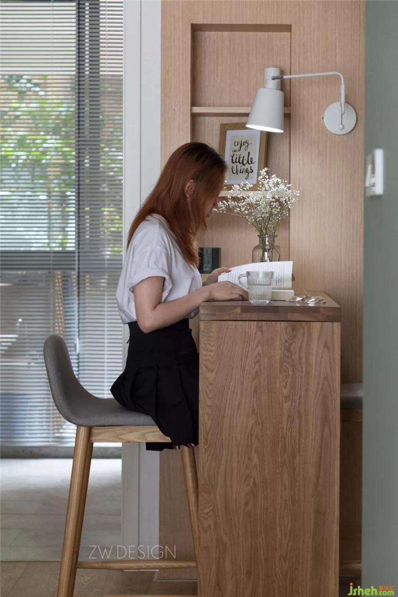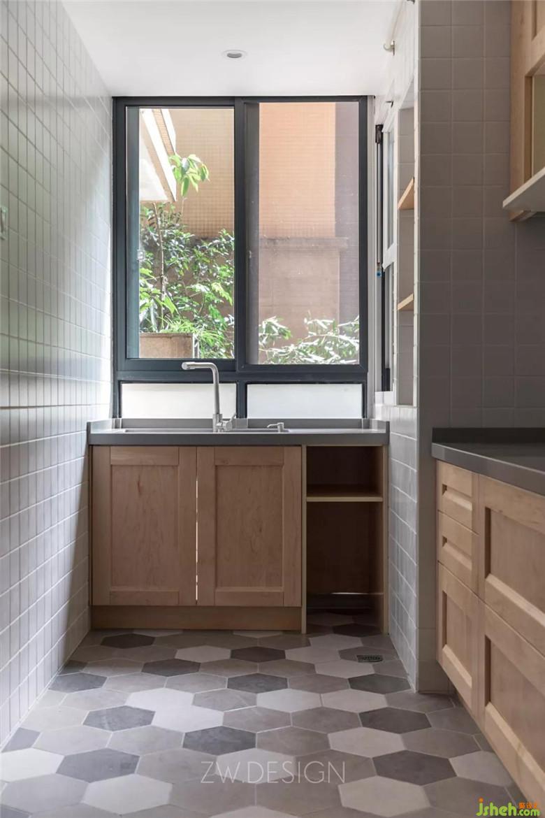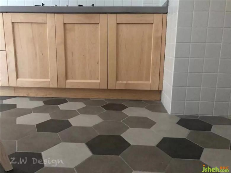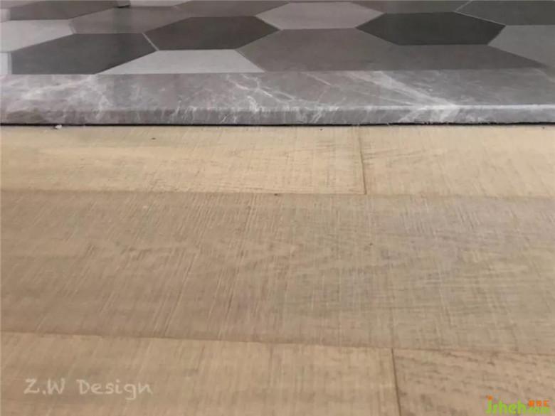 廚房與餐廳的地板銜接處,將整塊木地板嵌進(jìn)石材內(nèi),可以不使用扣條固定同時更加美觀耐用