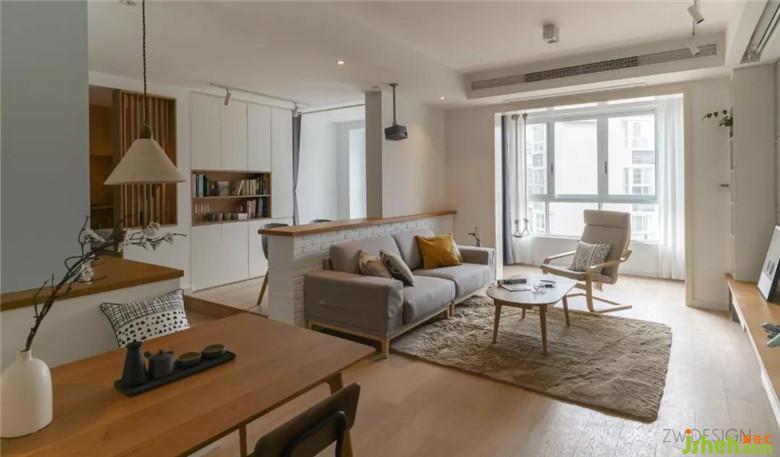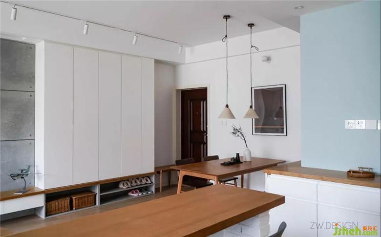 因為入戶門是緊挨著墻體的,所以我們將鞋柜退后了一些,放了一個實木換鞋凳作為緩沖。