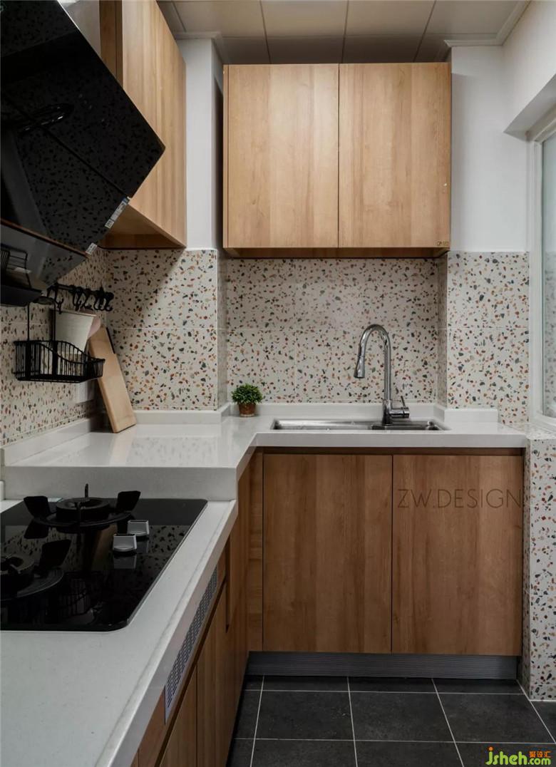 瓷磚貼了半墻,水磨石點綴單調(diào)的墻面。