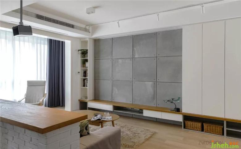 貼了美巖板作為投影幕布的背景墻,四個角加工打孔,水泥清水模既視感。