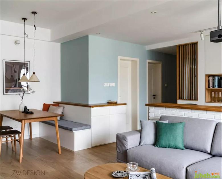 擴大餐廳的功臣,與卡座一體的餐邊柜,餐邊柜右邊是廚房。