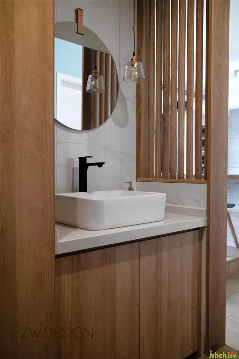 洗手臺正對著客衛(wèi)門,上廁所之后出門一步即可使用。洗手臺左邊是雜物柜,全家的大小雜物都可以放在這里,而且此處位于房屋中部,從這里出發(fā)到哪里都是最近的。