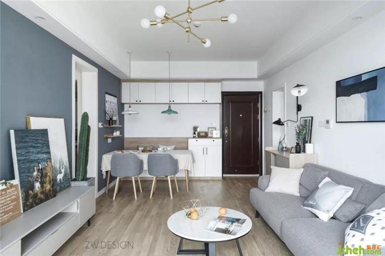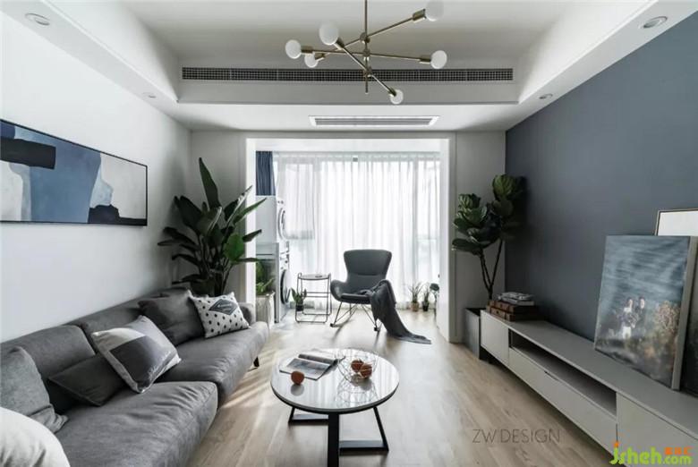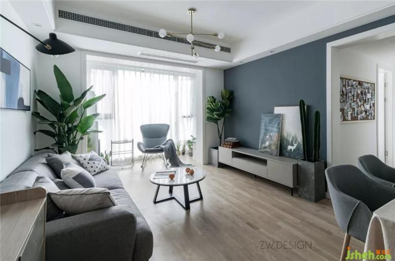 在客廳的整體色彩表達(dá)上,設(shè)計(jì)師主要采用霧霾藍(lán)與白色為主色調(diào),再搭配少許木色、墨綠色作為調(diào)節(jié)視覺感受的點(diǎn)綴