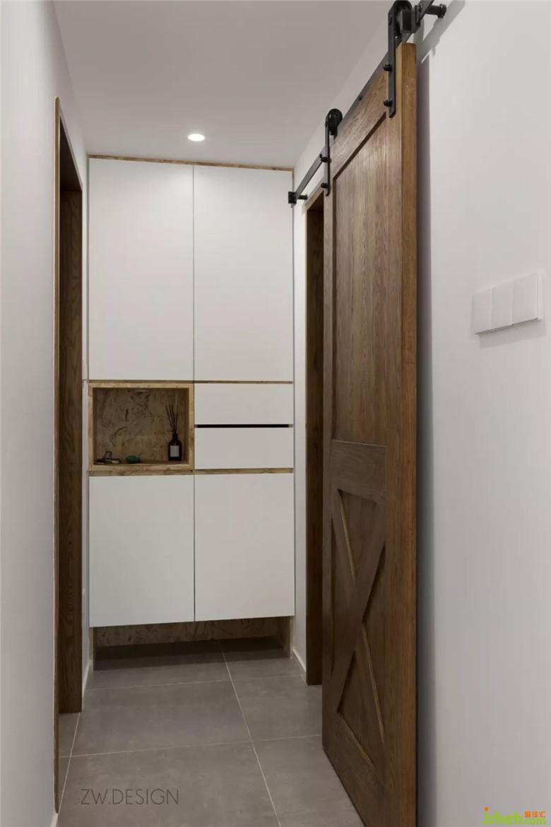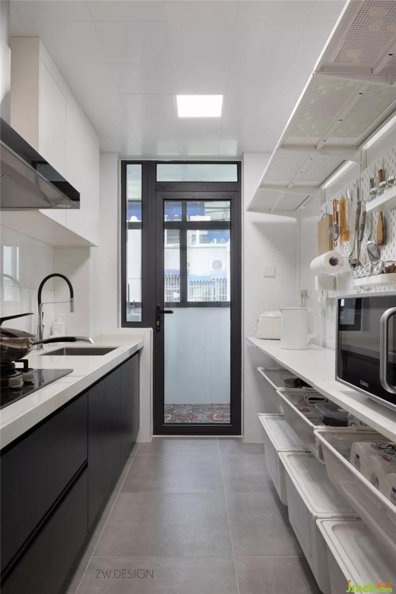 通過門洞位移,將動線往櫥柜一側(cè)移動,釋放出原本浪費的一側(cè)墻面空間,利用這個空間設(shè)計了宜家的艾格特(ALGOT)貨架,補充了廚房操作臺面的同時,增加了巨量的收納空間。相對兩側(cè)櫥柜的設(shè)計,艾格特有更好的靈活性、實用性和更高的性價比。次臥壁櫥也采用了艾格特貨架,屋主準備之后次臥先用來養(yǎng)狗狗,所以暫時空閑沒有拍照。廚房和生活陽臺墻面都采用了純白色瓷磚,盡可能多的將自然光線引入室內(nèi)。致物設(shè)計