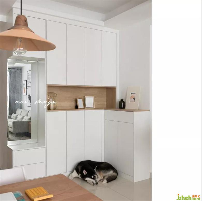 房屋實際面積不大,所以選擇給墻面留白,保持白色墻面的純凈和包容,家具以灰色、白色、櫻桃木為主。