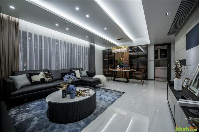 客廳很創(chuàng)新的設(shè)計了影院式天花,層次感分明,線條感也十分強(qiáng)。而主背景墻有人有意識的凸顯流線,這樣天花、墻面和地面的輪廓線在視覺上很好的拉伸了空間。