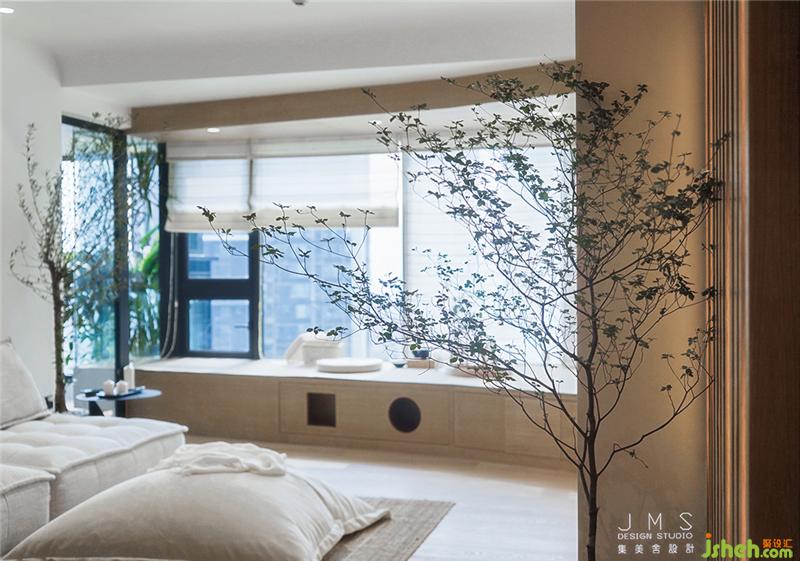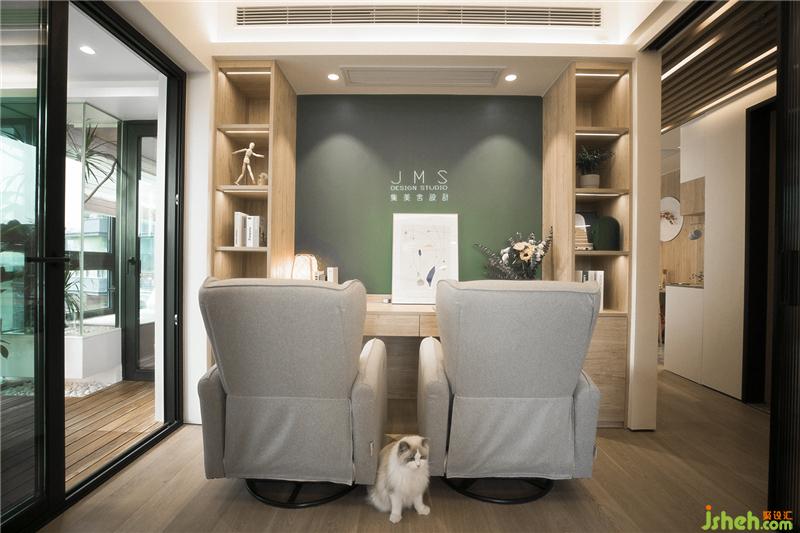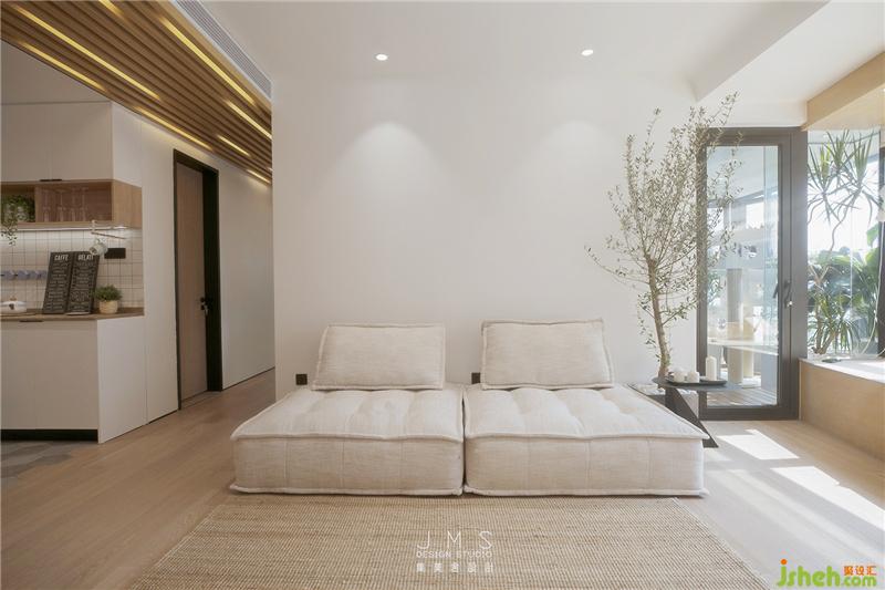 改造結(jié)束后的客廳充滿了日式的詩意和悠閑。木色的地板、閣柜、桌臺(tái),白色的軟包布藝沙發(fā)、柔軟的抱枕,以及一覽無余的潔凈墻面,點(diǎn)綴著淡雅的綠色,簡單的裝置和鋪陳,空間的雅致彰顯,讓擁擠浮躁的內(nèi)心也有了留白。原木色的通道嵌入流動(dòng)的燈光隔開外界與室內(nèi),營造如自然般的光感呈現(xiàn),匆匆前行的腳步也在這里開始變緩。