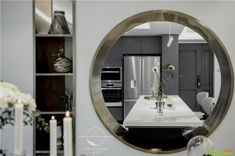 原戶型一進(jìn)門(mén)便正對(duì)廚房和餐廳,通常人家的做法是采用隔斷設(shè)計(jì),裝修設(shè)計(jì)但是這樣未免不夠通透。本次設(shè)計(jì)師別出心裁的采用了“透景設(shè)計(jì)”的手法,借鑒了中式園林中的花墻,將西廚和中廚聯(lián)通起來(lái)。