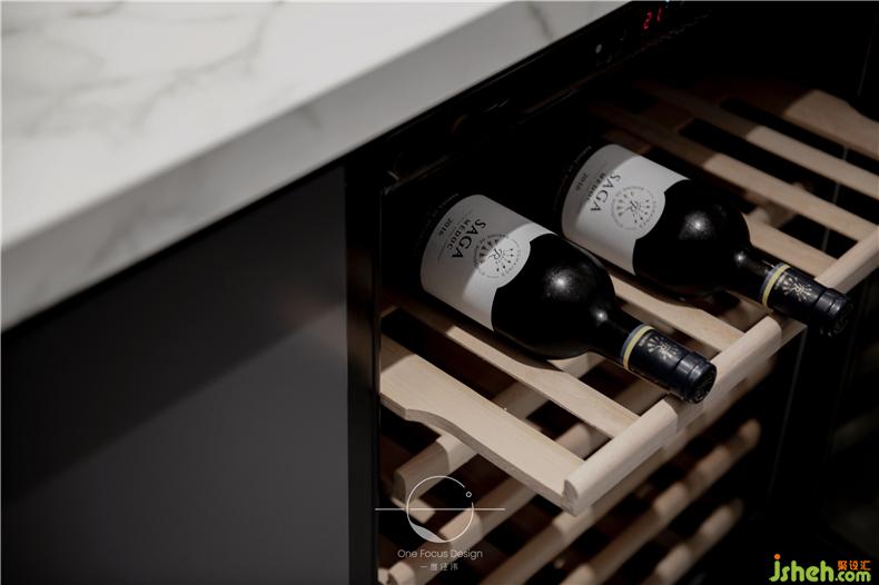 西廚整體采用灰色調(diào),典雅而精致。設(shè)計(jì)師還特意設(shè)計(jì)了酒架和吧臺(tái)式料理臺(tái),滿足主人的小酌一杯的生活樂(lè)趣。