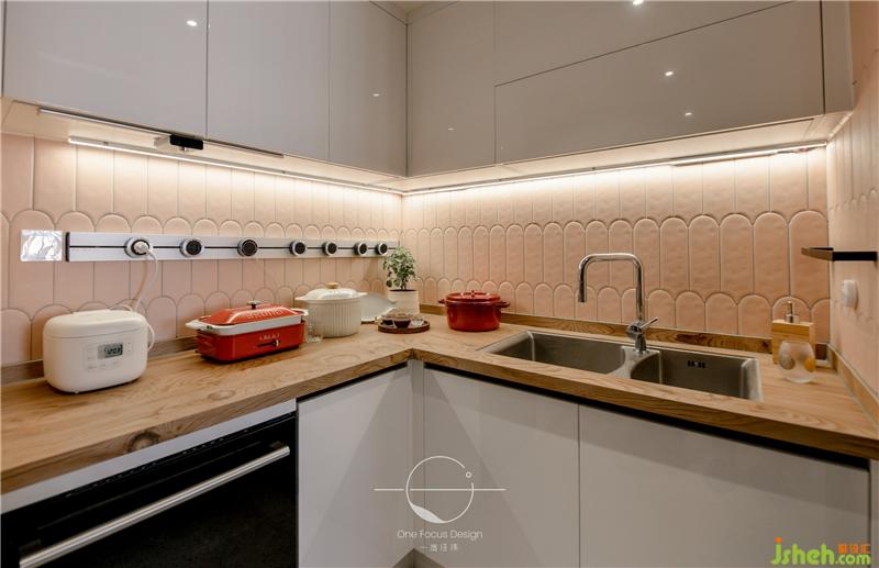 整體以暖色為基調(diào),木質(zhì)紋路的臺(tái)面與日式的主題相呼應(yīng),構(gòu)筑了溫馨質(zhì)樸并富有生活氣息的專屬格調(diào)。精致的內(nèi)嵌燈,整齊的廚房用具,整個(gè)空間看起來明亮又開闊。