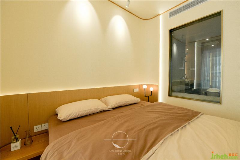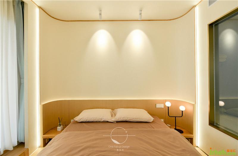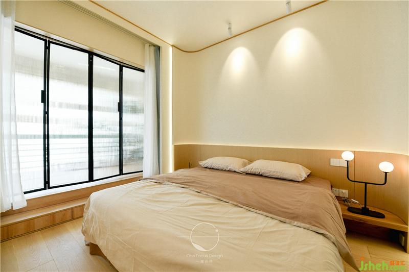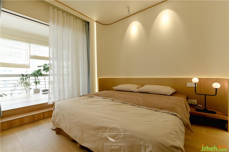 主臥與陽(yáng)臺(tái)相連,引景入室,紗簾和透明玻璃門(mén)若隱若現(xiàn)的阻隔讓空間氛圍變得自然而寧?kù)o,禪韻十足。臥室里內(nèi)嵌線條燈,在細(xì)節(jié)處勾勒出主人雅致的生活方式。