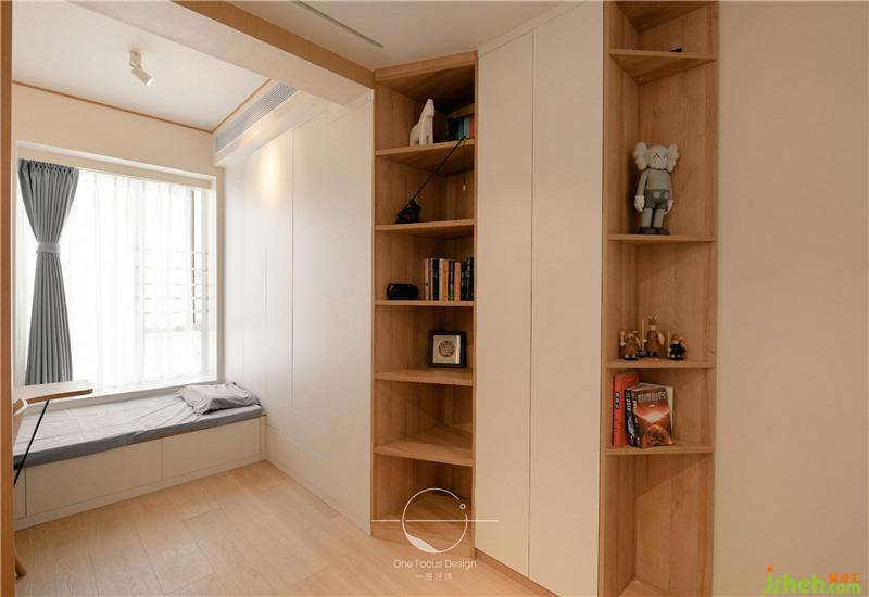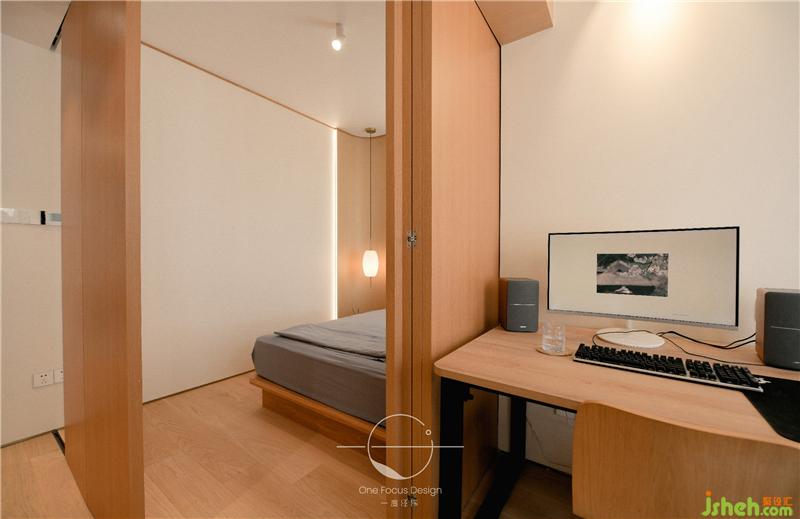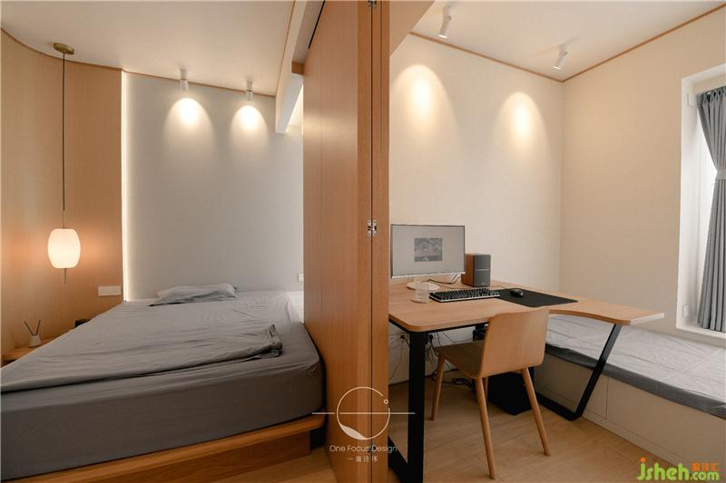 次臥大量留白的空間讓視覺漸漸放松下來,原木的基調(diào)看似樸實無華,但精美的擺件和燈光卻為簡約的空間注入了華彩和力量。
