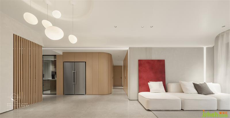 整個房屋的設(shè)計簡約,素雅而靜謐,在白色的主調(diào)下,設(shè)計師通過搭配少許的紅色點綴加以灰色的飾品,讓空間呈現(xiàn)出神秘的色彩美學。