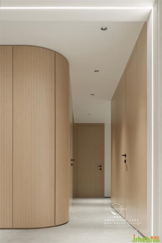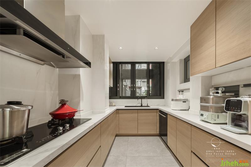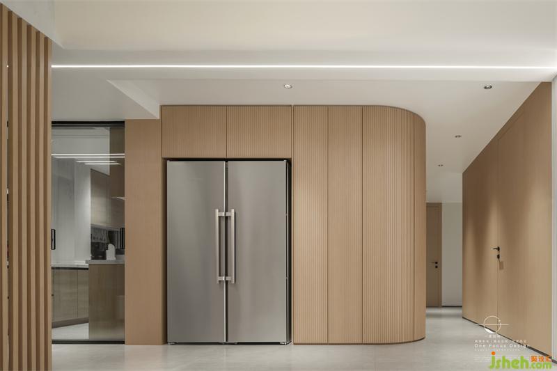 玄關(guān)一側(cè)就是廚房空間,廚房整體墻面以白色為基礎(chǔ),搭配木質(zhì)櫥柜與潔白的操作臺面,簡約的空間讓烹飪的氛圍更加輕松簡單。