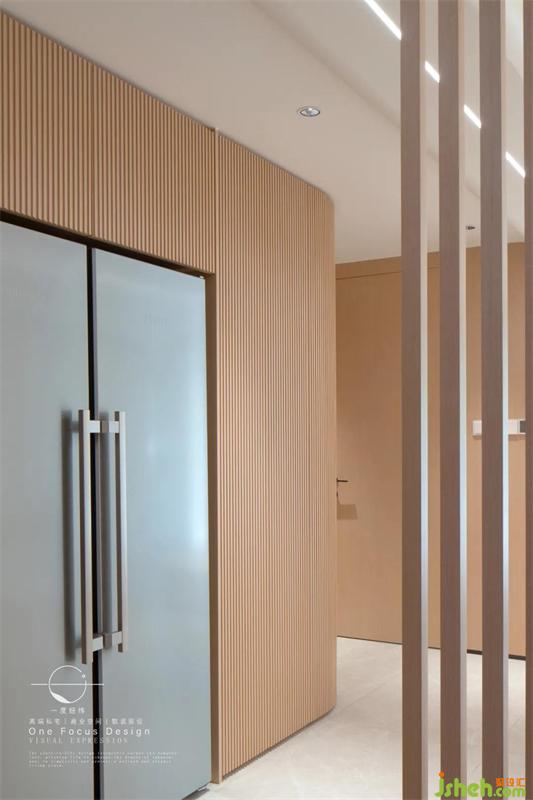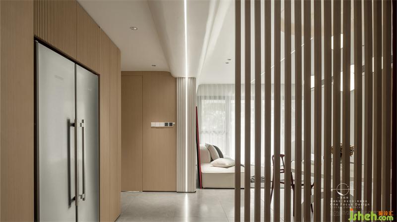 從玄關(guān)進入客廳空間,整體木制柜體與格柵透露出自然柔和的感覺。把原先的儲物間規(guī)劃入客廳,讓公共區(qū)域更加寬廣,整個室內(nèi)都充滿了陽光氣息。