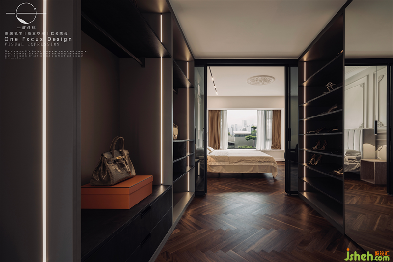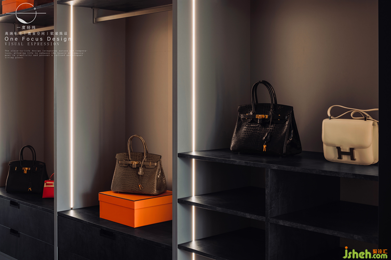 琳瑯滿目的包包與鞋物,那是多少女生夢幻的衣帽間!線性的燈光整齊規(guī)律,炫酷而夢幻的儲物空間,設(shè)計師不僅把控整體美學(xué)的視覺感官,也強調(diào)了家具到物品飾品等品質(zhì),為人的感官視覺體驗與居住舒適度打磨精細(xì)化細(xì)節(jié)。