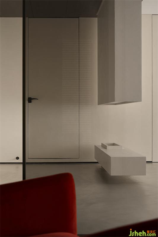 半懸空玄關(guān)隔斷與入戶鞋帽間、視聽室并置而設(shè):主人回家,白天工作情緒轉(zhuǎn)換之余,家人相互之間可以感受到彼此的動態(tài),而不驚擾。賓客友人進出視聽室經(jīng)過玄關(guān)時,可以感受到人的活動,而避免了眼神對視。