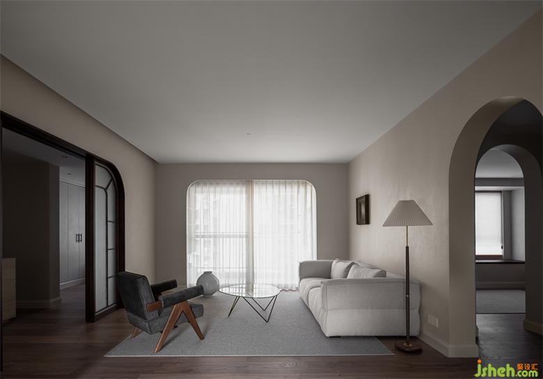 因主人工作長時(shí)間都處于一種消毒水夾雜金屬的氣味之中,且獨(dú)居生活。故,設(shè)計(jì)師團(tuán)隊(duì)將空間的空氣流通性、采光性和空間氛圍的紀(jì)念意義、自由性、安全感作為設(shè)計(jì)的基本考量點(diǎn)。比如:將原來采光與通風(fēng)不佳的次臥,改為由兩扇拱門組成、半開放的、兼具收藏、觀影、游戲的多功能空間,一方面作為主人展陳藏品的專屬空間,一方面滿足主人下班回家觀影的日常生活習(xí)慣,也為朋友偶爾在這里游戲提供了空間;援引靈感來自彩虹、具有藝術(shù)紀(jì)念意義的拱門形制連通主體空間,起居室與臥室通過一扇四聯(lián)拱形門形成自然區(qū)隔,并于客廳門窗造型形成呼應(yīng),人文與自然、古典與現(xiàn)代、虛實(shí)相生。家裝設(shè)計(jì)主人平日相中的古董器物藏品皆可任意置于某處,沏一杯熱茶,席地而坐,或把玩擺弄一番;或凝思格物,心流涌動(dòng);或僅是在物、心之間隙中體驗(yàn)?zāi)撤N荒謬、怪誕、虛無和無意義。再者,臥室與盥洗區(qū)同樣以弧形拐角墻體延申連接,以及弧形抹角的方形開窗,用以柔化空間,不著痕跡地在主人臨睡前向其釋放一種踏實(shí)、放松、安全的心理暗示,得一夜無夢好眠。以上,不一而具。
