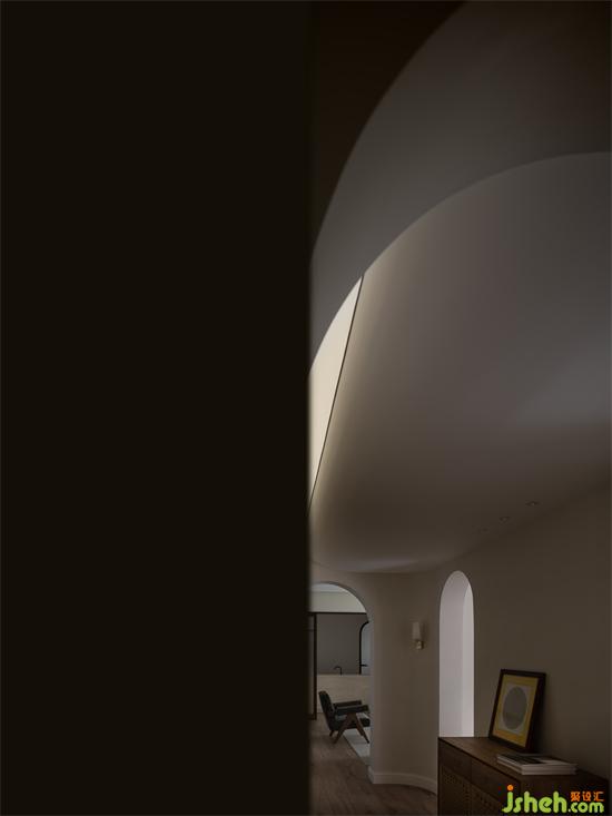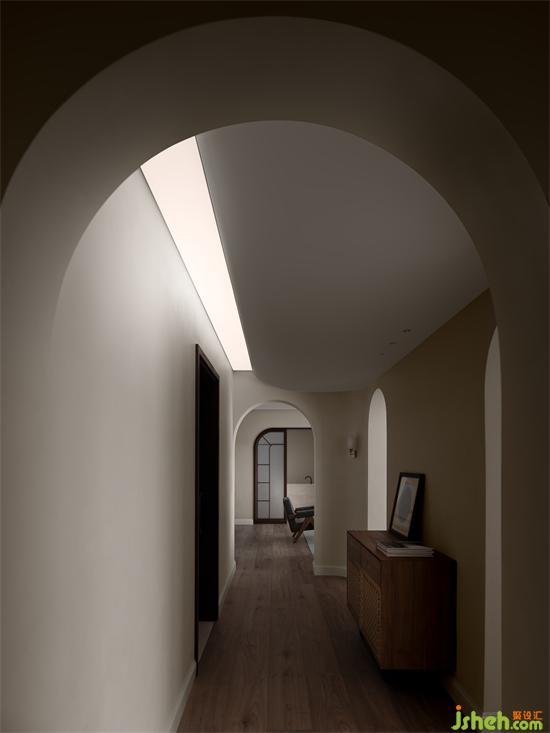 As the working environment is surrounded by metal and a smell of disinfectant water. the designer team pay much attention to the space air circulation, lighting and the commemorative significance, freedom and security of the space atmosphere. For example, they changed the second bedroom, which is of poor lighting and ventilation originally, into a semi-open multi-function space consisting of two arches for the hostess to collect, see movies and play games. The artistic memorial arches connecting the living room and bedroom draws inspiration from rainbow. They echo with the living room and windows to create a sense of humanities and nature, classical and modern, virtual and real. The antique collection of the hostess can be placed somewhere in the house. She can drink tea, sit and think.Moreover, the bedroom and washing area are also connected by an arc which can soft the space and make the hostess relaxed. Of course, the creative designs of the house is not limited to these above.