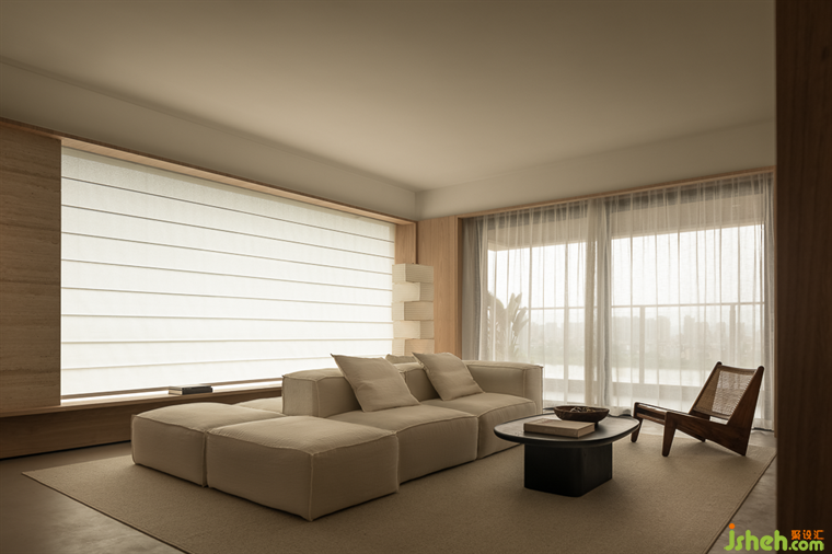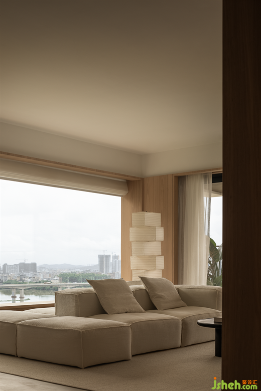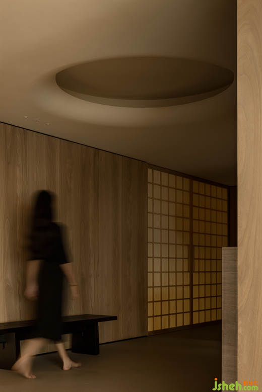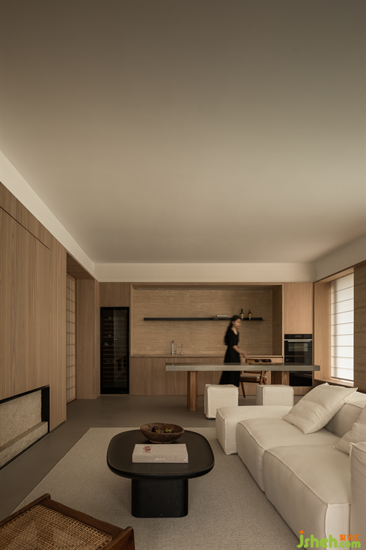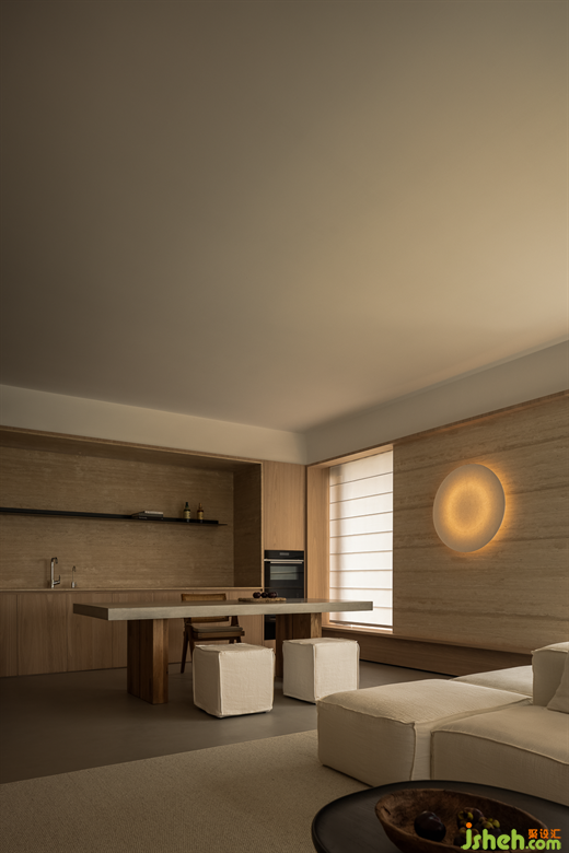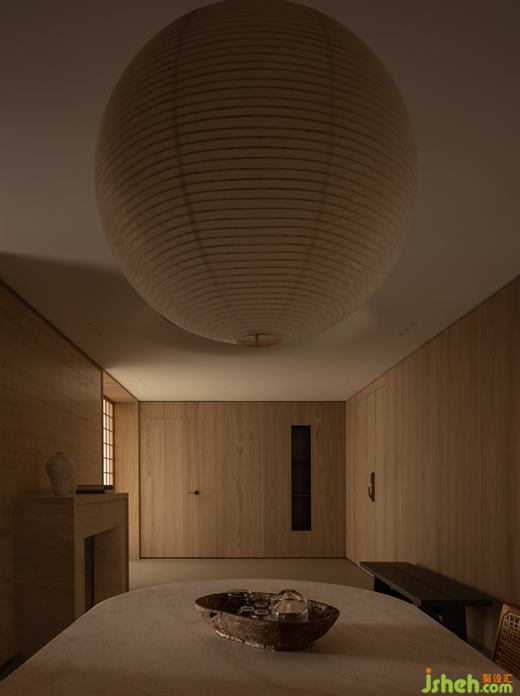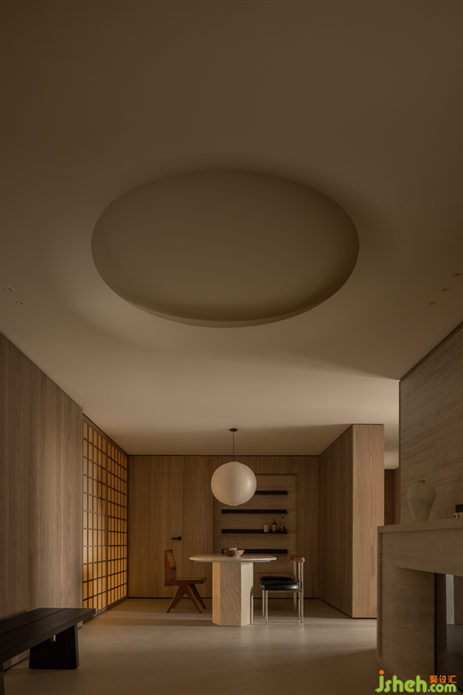 藏而通達,隱有乾坤。從玄關(guān)進入前廳,是一個聚合與流轉(zhuǎn)區(qū):私宅設(shè)計暗色木質(zhì)條凳與淺色石紋壁爐形成與餐廳融合的第二玄關(guān),新風(fēng)與照明功能隱于天花圓頂之中,開合之間自由聯(lián)通廚房、客廳、臥室。動靜虛實,思深言淺,以至平和。