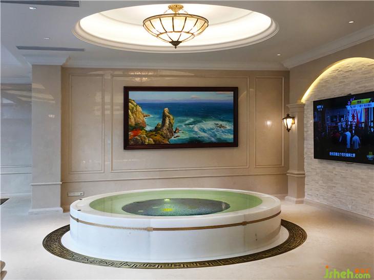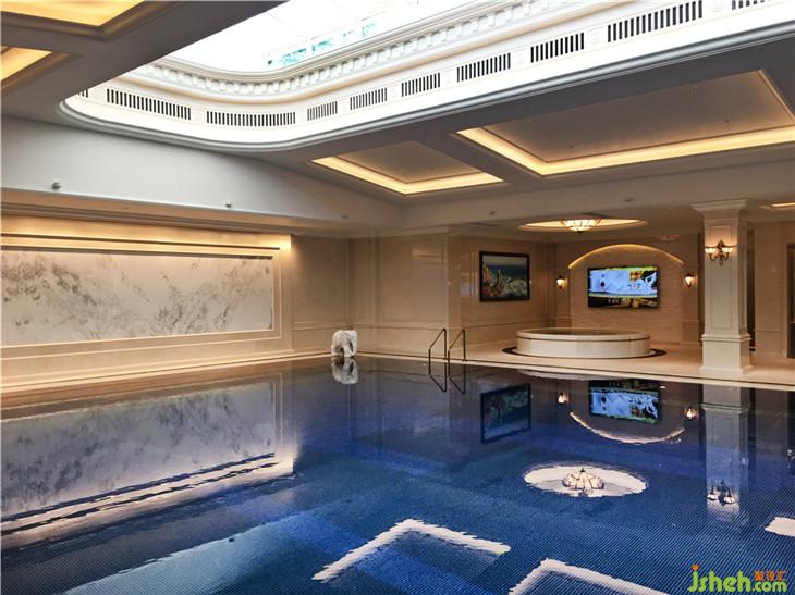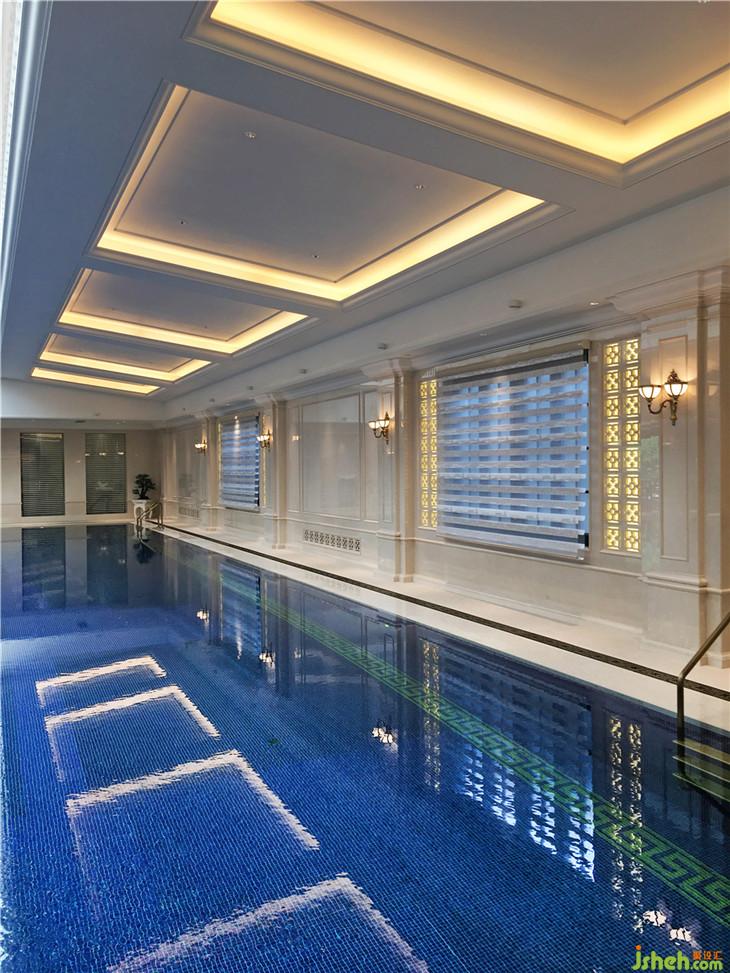 專(zhuān)業(yè)的燈光設(shè)計(jì),更增添了空間品質(zhì)也層次感。自動(dòng)伸縮采光天井,使空間有日夜變化,藏藍(lán)色的馬賽克與24K金箔馬賽克點(diǎn)亮整個(gè)水面,波光粼粼更有靈氣。衛(wèi)生間與黃桶房色調(diào)與燈光考慮完美的使用功能。天花吊燈選用美式古典風(fēng)格,高雅尊貴。