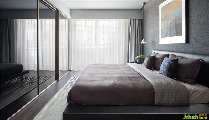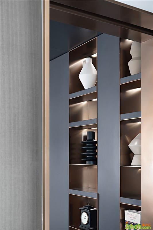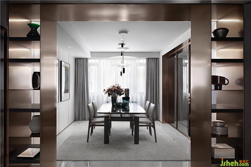 空間采用中性色調(diào)與簡(jiǎn)潔利落的紋理與造型,賦予空間鮮明獨(dú)特的個(gè)性?;焐罄硎Y(jié)合金屬質(zhì)感的柜體,利用木質(zhì)、玻璃、金屬這些工業(yè)性較強(qiáng)的材料,高級(jí)純粹灰色系的巧妙融合,完美地呈現(xiàn)了現(xiàn)代奢華的格調(diào)。