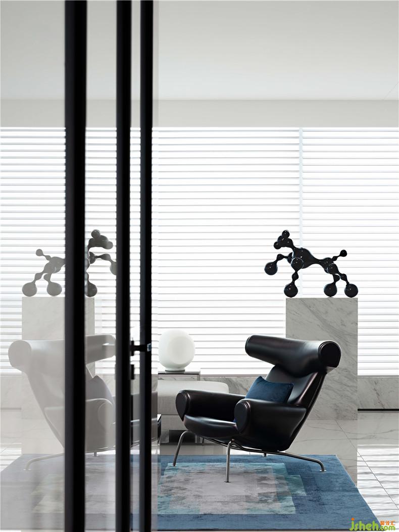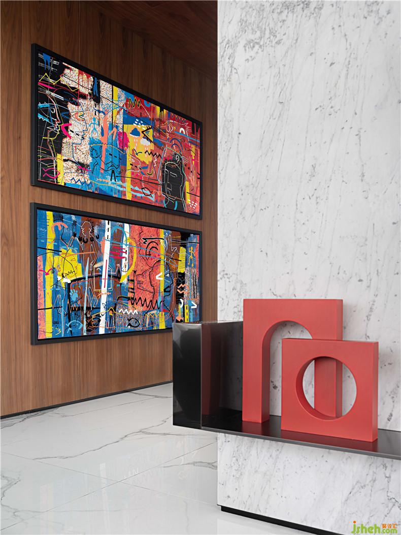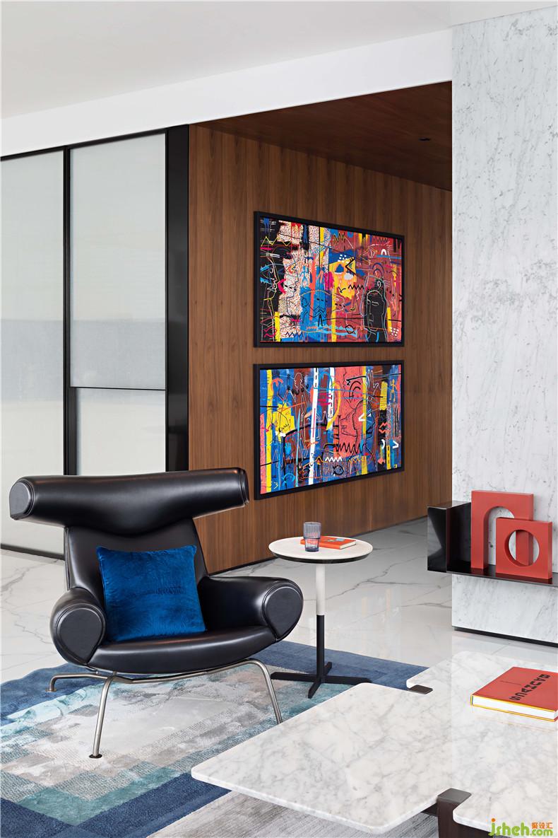 在達(dá)利這種反映夢(mèng)境和想象的“瘋狂”作品的啟發(fā)下,設(shè)計(jì)師在書房空間大膽選擇了類似達(dá)利作品中的家具造型,并選取了另一幅當(dāng)代藝術(shù)家的相同風(fēng)格作品與之搭配。裝修設(shè)計(jì)而達(dá)利作品中經(jīng)常出現(xiàn)的配色,也占據(jù)著這個(gè)房間:黃色的空間中,暗綠、咖啡色、橙色的物品正扮著鬼臉。