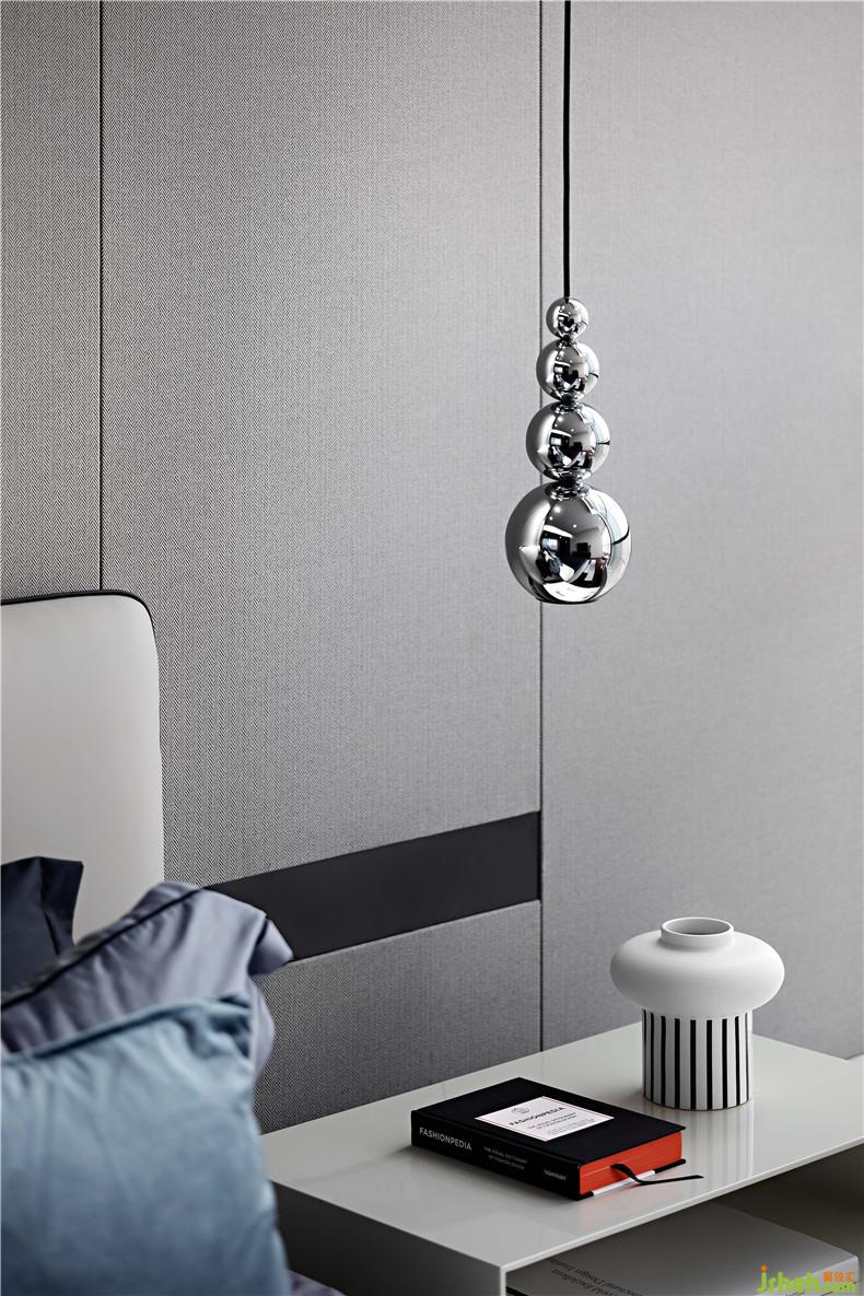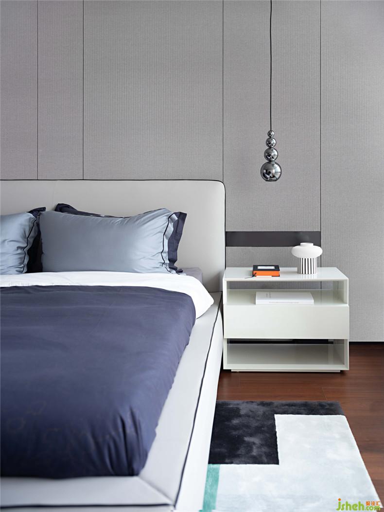 這種“沖突感”正是設(shè)計(jì)過程中刻意創(chuàng)造的“彩蛋”。兩間臥室呈現(xiàn)著一明一暗的對(duì)比效果:一間以藝術(shù)家的迷幻音樂題材作品揭開序幕,用少見的配色和材質(zhì)組合延續(xù)這種冷靜又神秘的氣質(zhì);另一間以大都會(huì)博物館大衛(wèi).霍克尼的作品海報(bào)點(diǎn)亮暗調(diào)的空間,以他標(biāo)志性的明快藍(lán)色和意思俏皮感增添了空間的趣味。