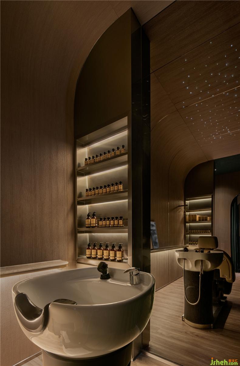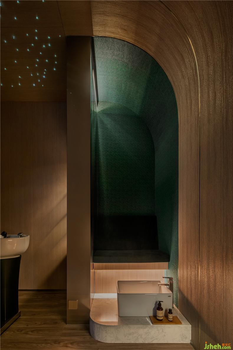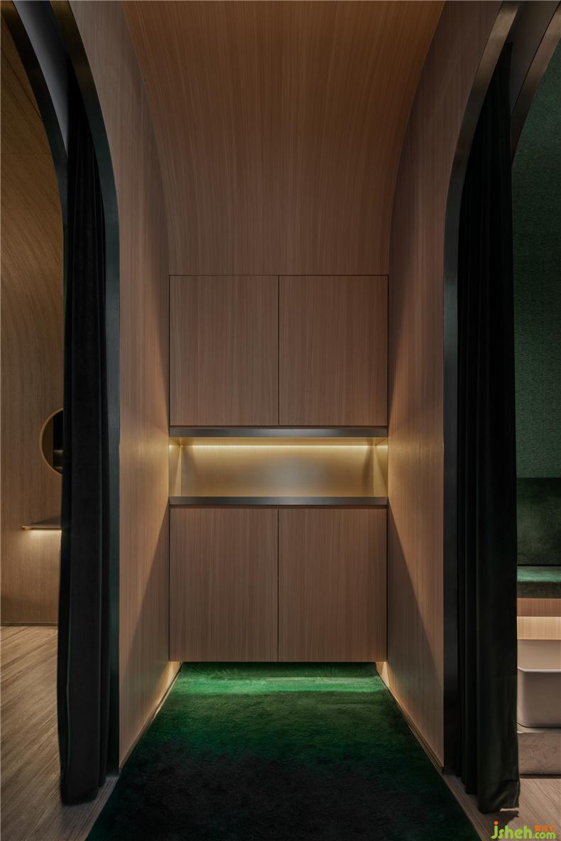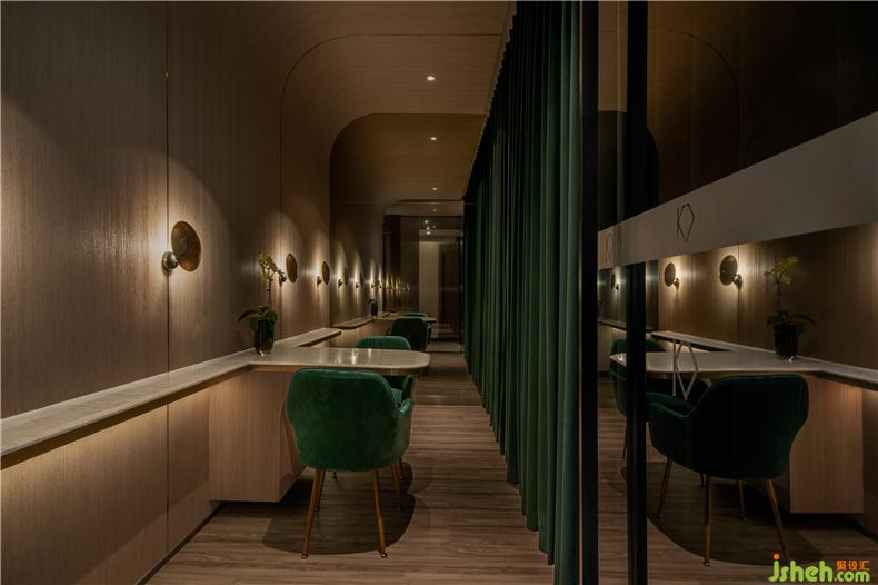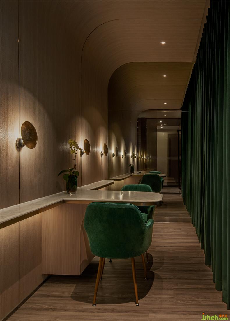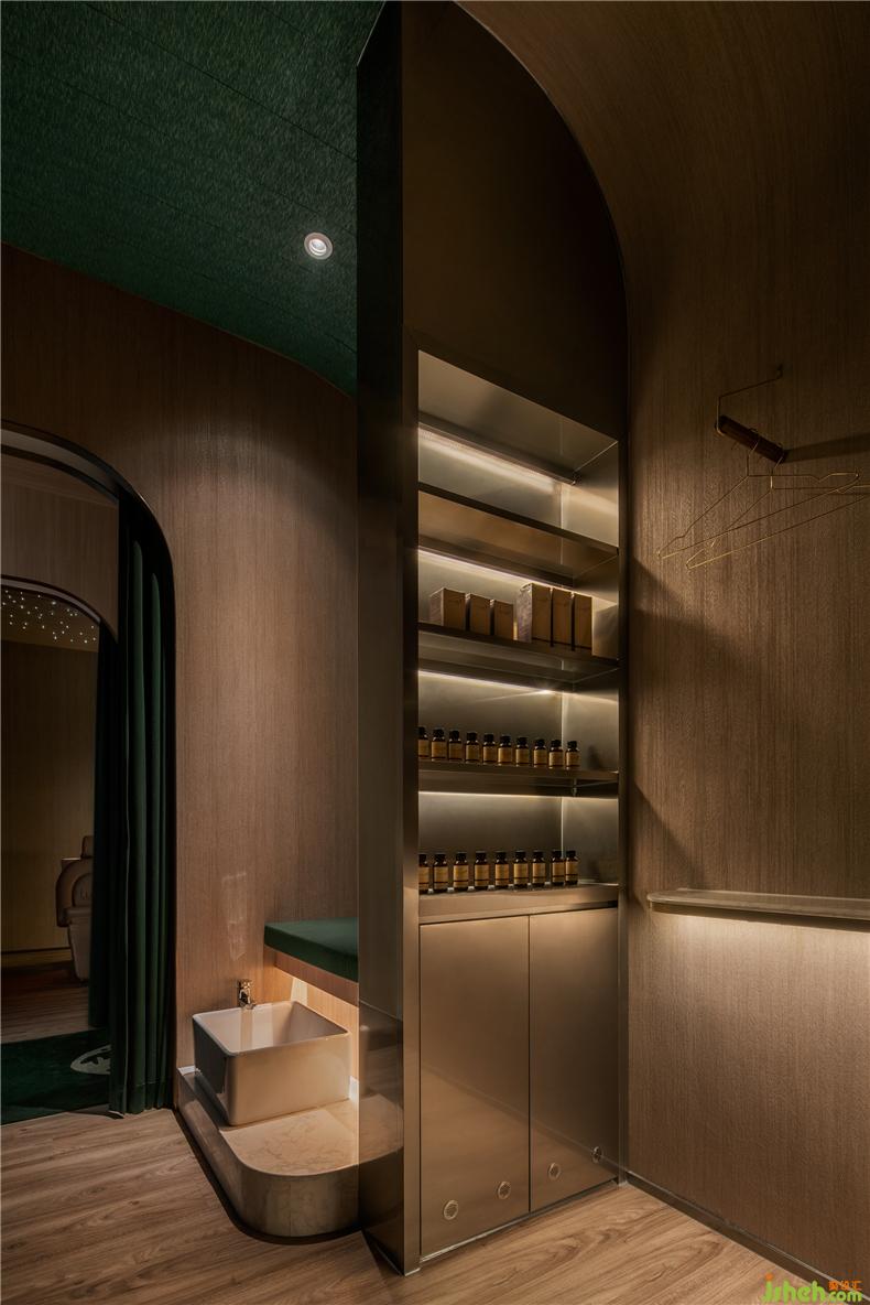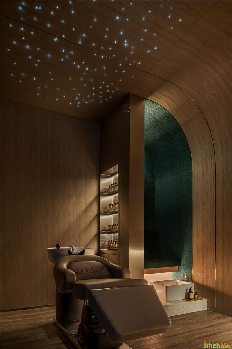 設計師堅信愉快的消費體驗來自無微不至的細節(jié):咨詢室以列車餐車為設計靈感,如同兩三摯友暢談聊天,打破了零售空間中常見的買賣對立的關系,其中氛圍,好似列車經(jīng)過隧道,車廂亮著壁燈的溫暖場景;而展示產品的壁龕,也以列車中餐車的形式展現(xiàn)。進入護理區(qū)域,浴足座位再現(xiàn)軟臥包廂的感覺,天花則處理成半弧形,當客人護理時,躺臥于沙發(fā)座椅上,室內設計師視線接觸比較多的天花,所見是若明若暗的星空。