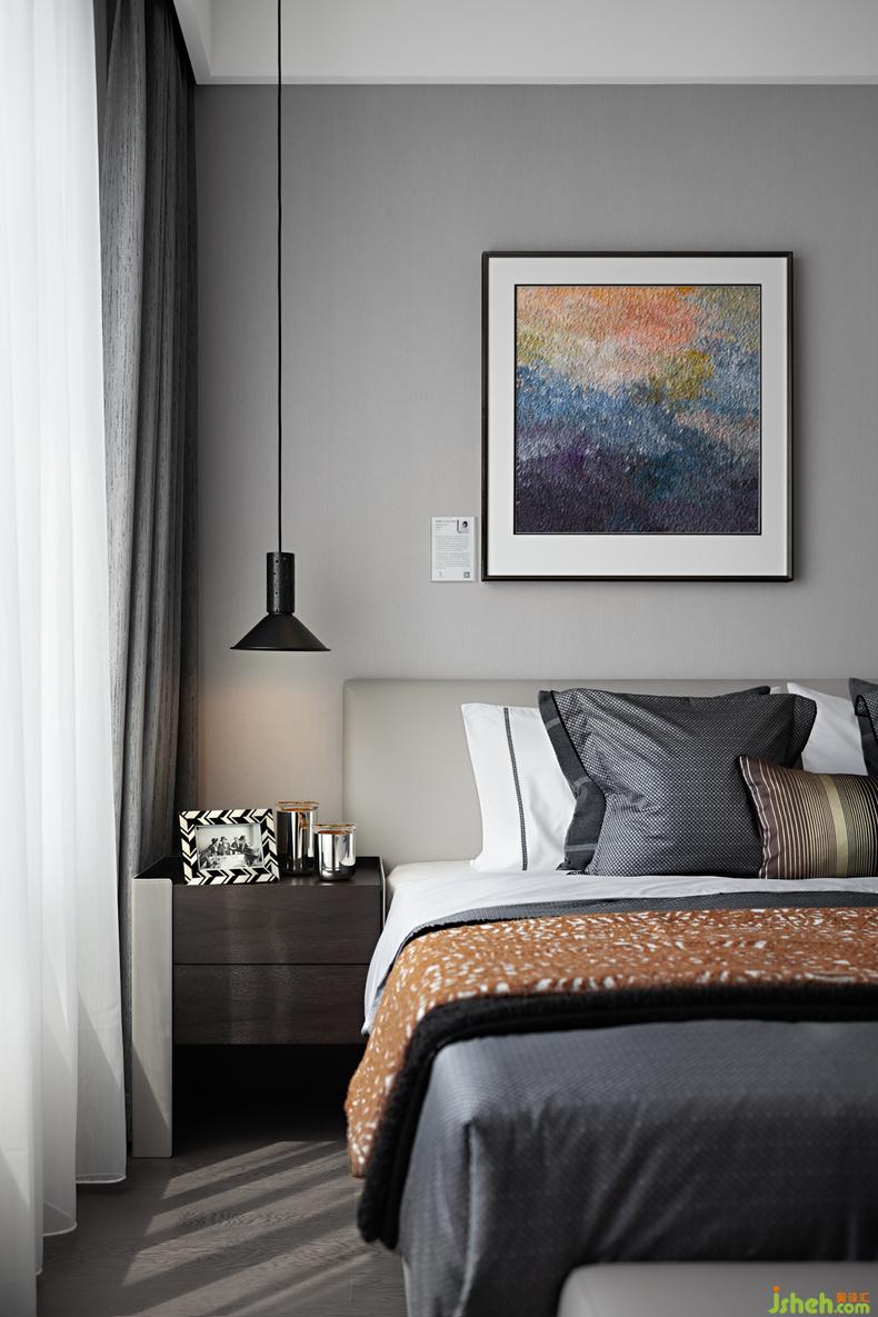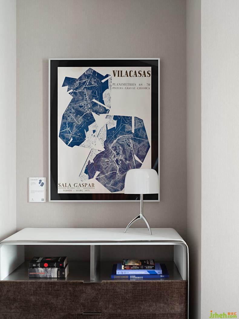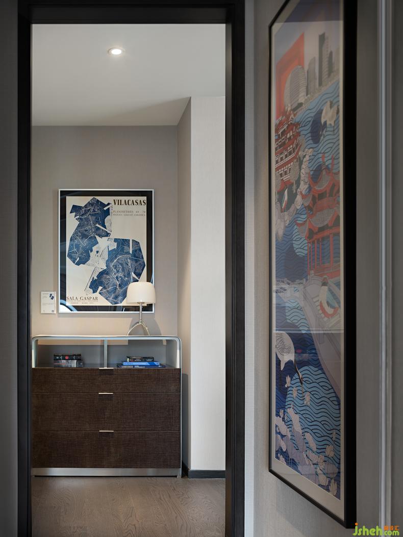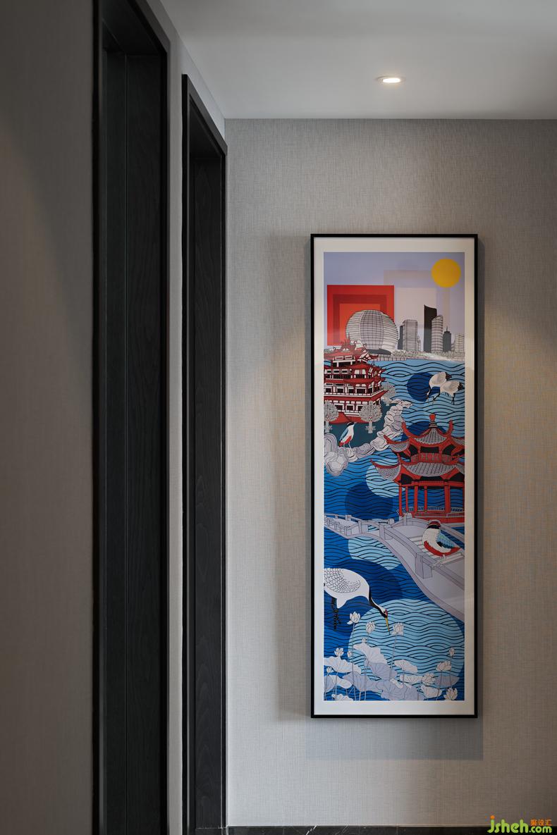 走廊盡頭處特意選擇英國藝術(shù)家Rob Pepper的《A Portrait of Hangzhou杭州印象》,以獨(dú)特的視角,大膽、優(yōu)雅的筆觸呈現(xiàn)一個(gè)獨(dú)一無二的杭州印象。臥室則是中國藝術(shù)家田丹露的《曙色遠(yuǎn)連山色起》,樣板房設(shè)計(jì)以幻點(diǎn)色彩的藝術(shù)手法詮釋一個(gè)霧雨朦朧的感覺空間,感受空間中帶來的平和寧靜與治愈身心時(shí)的沉醉。