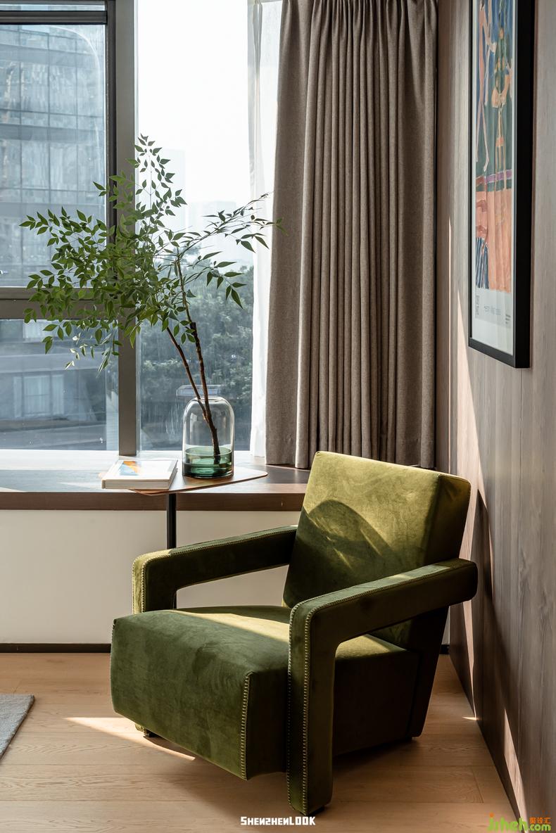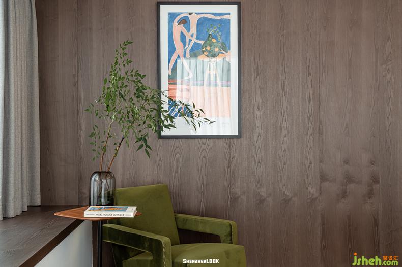 來自馬蒂斯博物館的海報與私人定制的祖母綠單人沙發(fā)相互作用生成和諧的生活場,豪宅設(shè)計打破主臥大面積木質(zhì)墻面的秩序感,這種富有韻律感的生活美學(xué)與李先生追求的生活狀態(tài)無比契合。