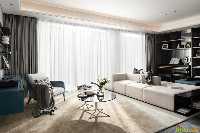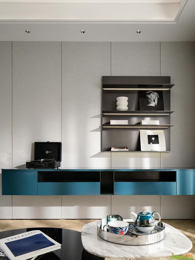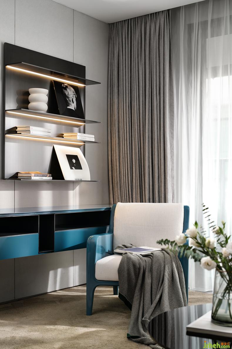 以“書墻”作為主視覺,書籍是時間的儲存器,感應(yīng)著男主人一本書籍一杯咖啡的安靜的獨享空間、女主人與朋友交流美食烘焙攝影的美妙時刻、又或者是輕松愜意的欣賞一首孩子彈奏的鋼琴曲......在灰色與藍色材料色彩的交織中,給人以寧靜和專注感,為家里創(chuàng)造靈動的精神一隅,呈現(xiàn)一種不緊不慢的生活狀態(tài)。