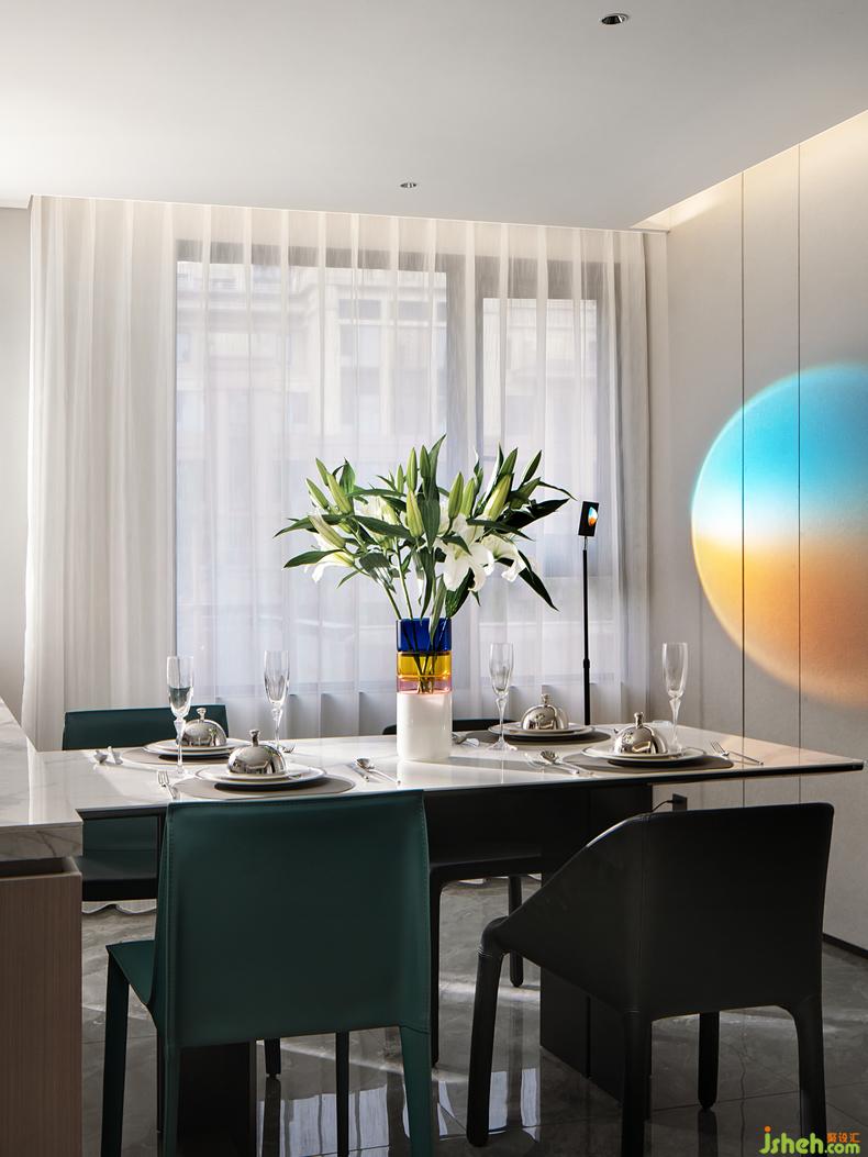 家也是個性與共性并存的空間,樣板房設(shè)計熱愛生活并把更自由的能量在家里傳遞。意大利halo edition品牌的落地燈立于餐廳一側(cè),將落日余暉的浪漫與光影的物理反應(yīng)肆意揮灑至每個美食時刻。藝術(shù)家田丹露的作品--《何必崎嶇上玉清》透過畫面與色彩跨維度的交流,漫游于富有韻律的色塊細微肌理中,讓業(yè)主收獲屬于自己的愉悅與希望。
