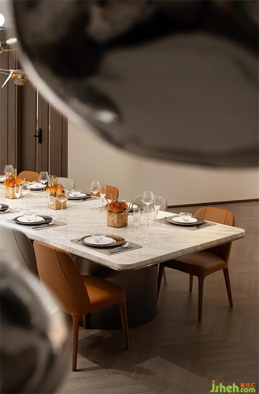 生活是藝術(shù)生長(zhǎng)的養(yǎng)料,而空間是生活方式的場(chǎng)景化。繞至宴會(huì)廳后側(cè),九廬NOVE CLUB會(huì)所設(shè)計(jì)在造型與設(shè)色的形式表達(dá)上,設(shè)計(jì)師有意通過(guò)一定的留白與燈光烘托下的明暗關(guān)系,營(yíng)造舒適閑雅的人文體驗(yàn)。時(shí)光流轉(zhuǎn)間,從容自如的狀態(tài)貫融整個(gè)空間,最終落點(diǎn)于圈層認(rèn)同下的場(chǎng)域共鳴感。