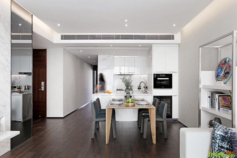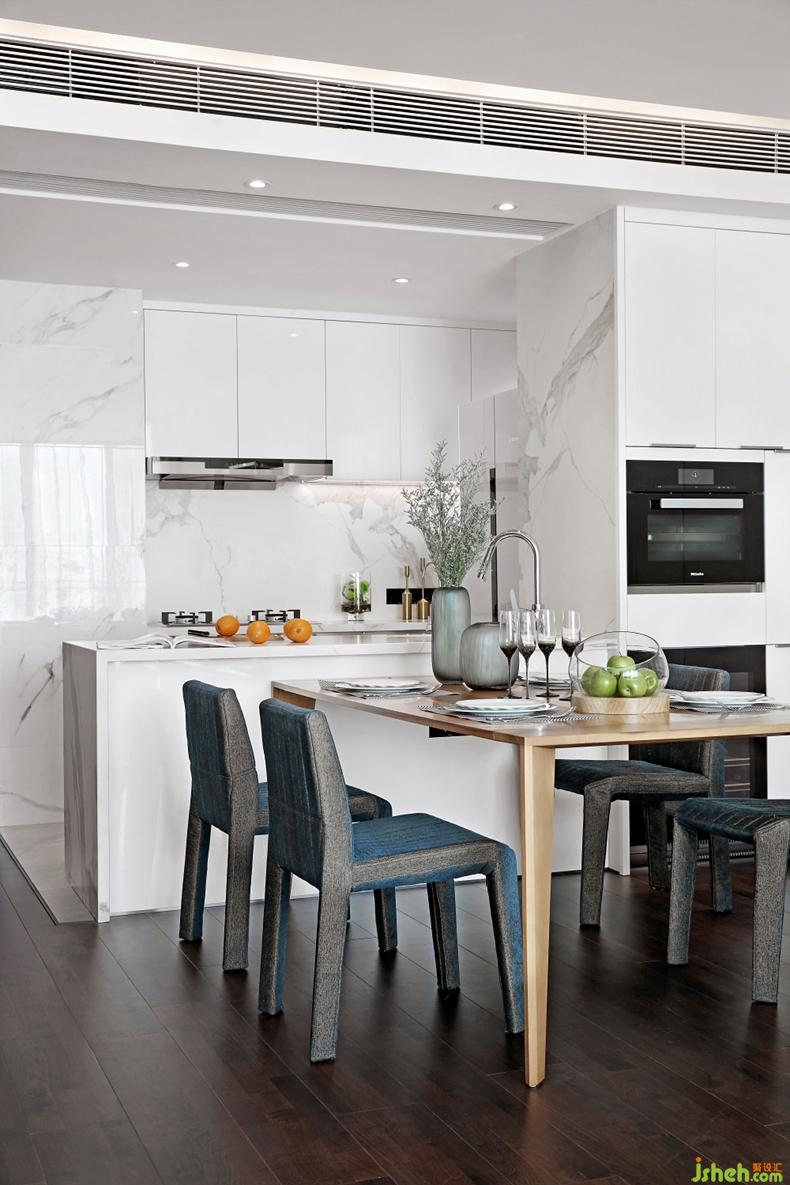 我們有意模糊各空間的界限,客廳作為空間樞紐區(qū)域,其軸動線貫穿餐廳以及廚房,進而創(chuàng)造一種趨于豐富且多元化的居家模式。深圳別墅裝飾空間簡潔明凈,以白色為主基調(diào),溫和的淺灰色退居其次,結(jié)合白色大理石的自然紋理走向,讓空間背景兼顧美觀舒適的同時,植入靜逸純粹的精神觀感。