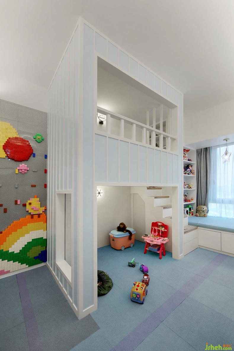 運(yùn)用了小復(fù)式的結(jié)構(gòu),讓兒童房呈現(xiàn)一個(gè)童趣盎然的奇妙世界,滿(mǎn)足萌動(dòng)童心。既有樂(lè)高墻,又有凸窗部分的閱讀區(qū),運(yùn)用這些不同的功能區(qū)間,培養(yǎng)兒童的想象力和創(chuàng)造力,探索新世界。
