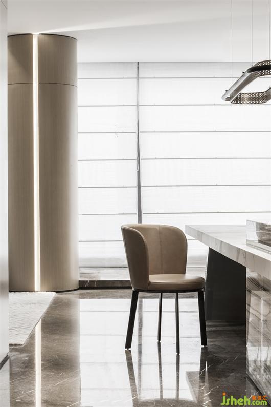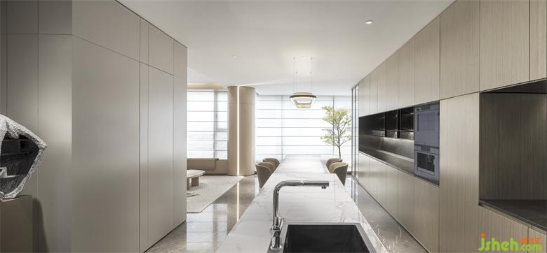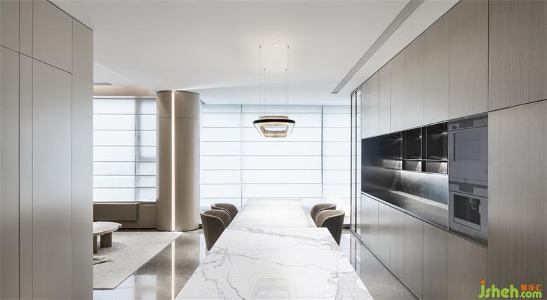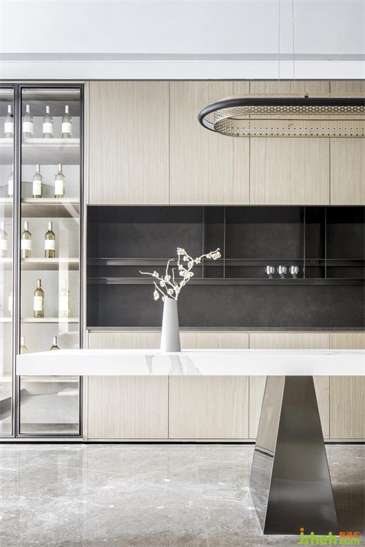 烹飪是一種快樂,在追求廚房社交屬性的當代,設計師將客餐廳不同部分的聯(lián)系建立在流線帶來的自由度上,并讓區(qū)域之間有著互通邏輯的流線。