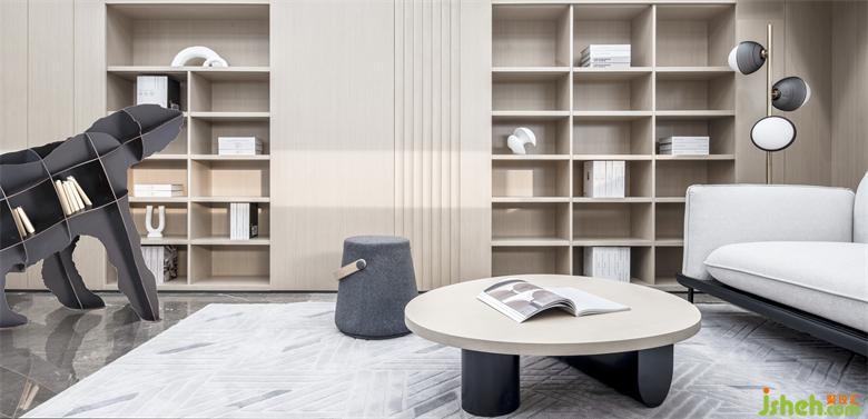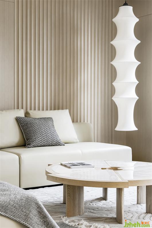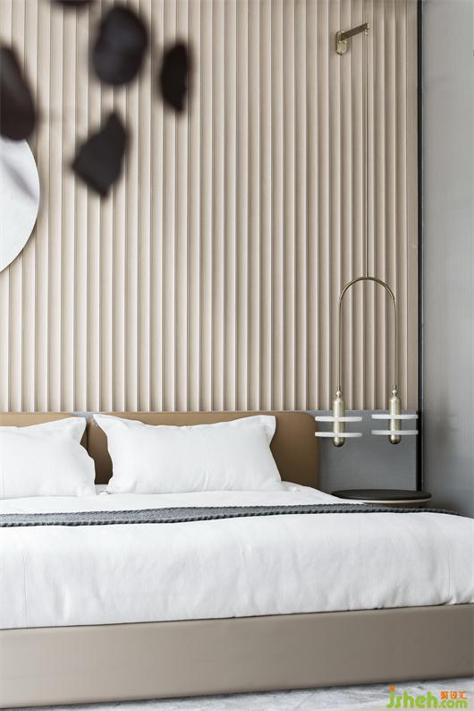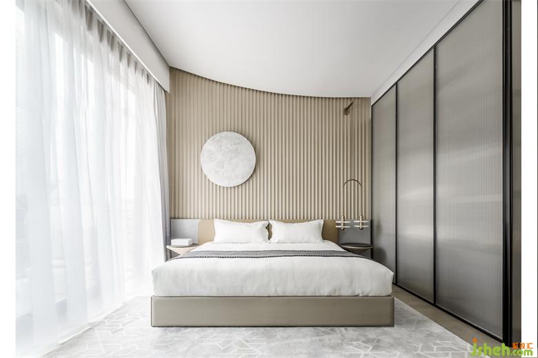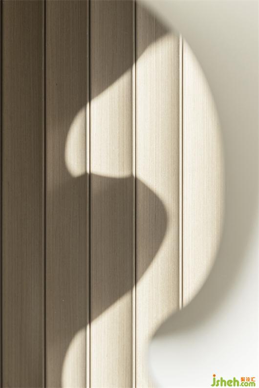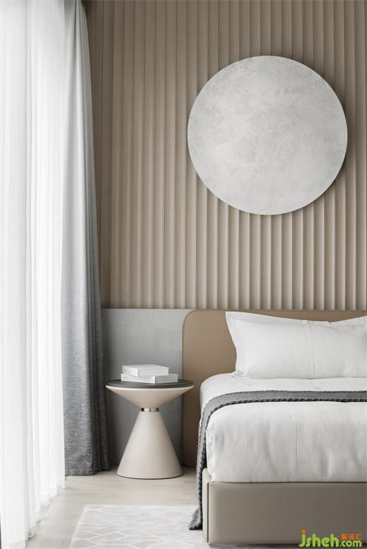疊墅樣板房設(shè)計(jì)師善于用光學(xué)技巧與幾何學(xué)法則打造出帶有自然、夢境與意念相糅合的空間場景。大面積的木飾面采用了弧形的設(shè)計(jì),細(xì)節(jié)考究,加上四時(shí)不同光線的提煉,讓空間界面浸潤在陰影的交錯(cuò)與明暗之中,凸顯出時(shí)間對于空間的意義。床頭背景墻一輪灰色的月影,在光線充沛的白日,如同月之暗面一樣安靜的存在著。待到日暮時(shí)分緩緩亮起,為室內(nèi)灑下安靜皎潔的“月光”。