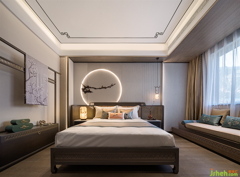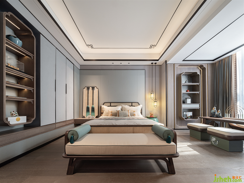 從電梯上至二樓,別墅樣板房設(shè)計(jì)映入眼簾的是三幅采用實(shí)木雕花工藝的中式元素掛畫,一步一景,穿過(guò)走廊,步入至次臥室空間,輕紗一般的陽(yáng)光穿過(guò)碩大的落地窗灑入屋內(nèi)時(shí)。深灰色與艾綠、沙石黃的邂逅,磅礴壯美,疏密有度,遠(yuǎn)近濃淡如煙波浩淼兼水草豐茂的江湖,不落俗套。