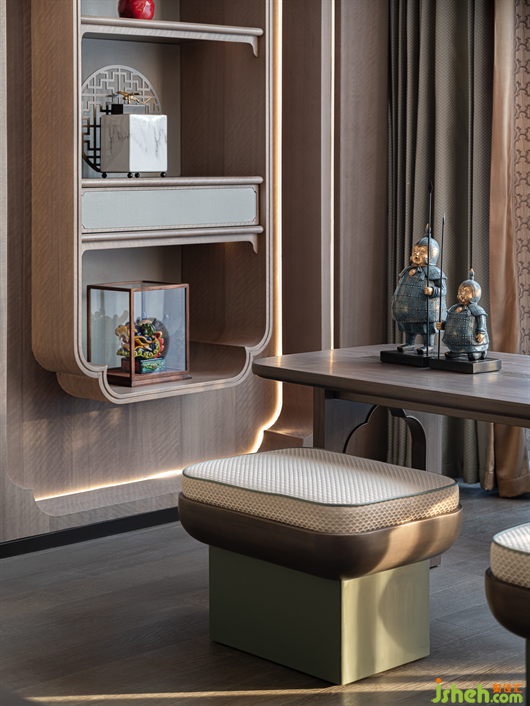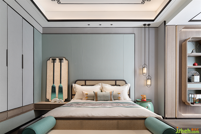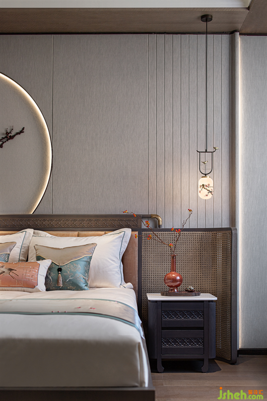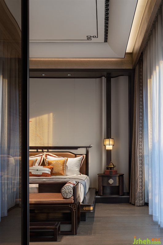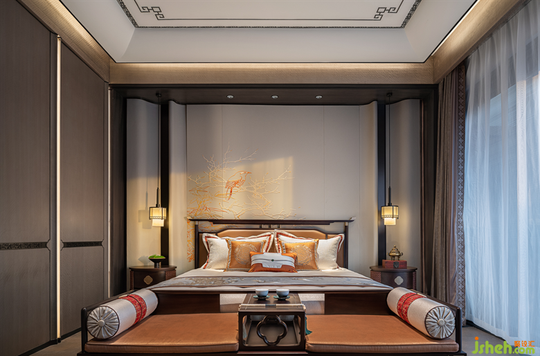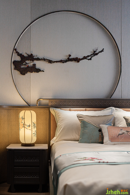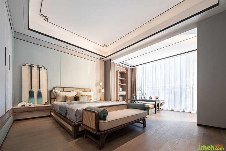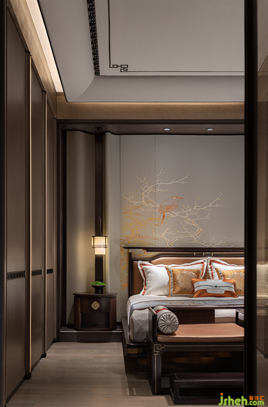 三樓為主人夫婦的專屬空間,主臥風(fēng)雅意境既保留了古典東方的樣貌,又不失空間主題文化元素的交融呼應(yīng)。別墅樣板房設(shè)計(jì)花鳥、山水、筆墨自由融合的意境,為睡眠空間平添一份靈動(dòng)之氣,將東方之意引入更悠遠(yuǎn)的境地。