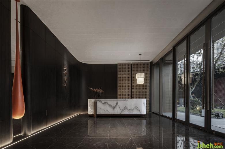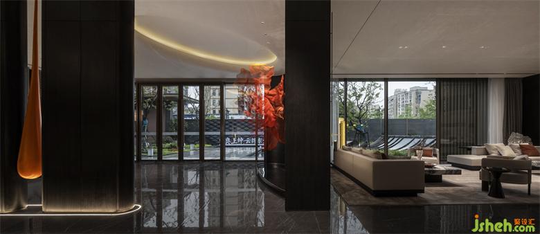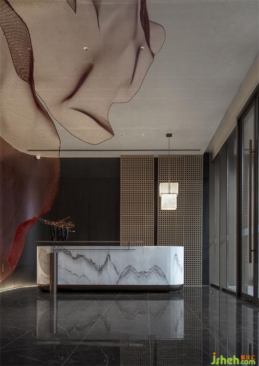 售樓處入口的接待大堂,是一個(gè)擁有沉靜安寧氣場(chǎng)的空間,而在這個(gè)深色調(diào)的空間中,一塊完整的山水紋大理石如同山水長(zhǎng)卷般在空間中心徐徐展開,它和極簡(jiǎn)的金屬線條構(gòu)成了接待臺(tái)的全部體量,這是一筆點(diǎn)睛的留白之筆,售樓處設(shè)計(jì)在燈光氛圍的烘托和聚焦之下,人流會(huì)像魚群一樣很自然地被吸引過去,如同走向故宮珍寶閣中展開的供人觀賞的千年畫卷。